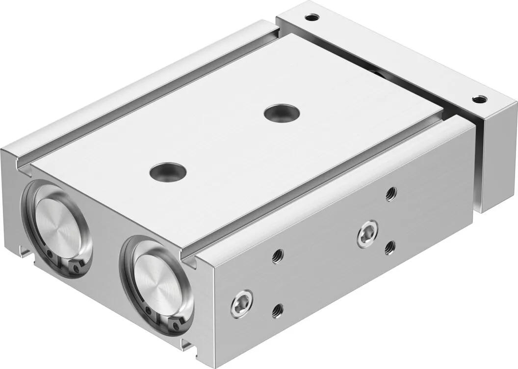 Minimal space requirement , Minimal mounting time , High resistance to torques and lateral forces , High rigidity thanks to its guide rods with large diameter and two plain-bearing bushes , Wide range of mounting options , Drive and guide unit in a single housing , Plain bearing