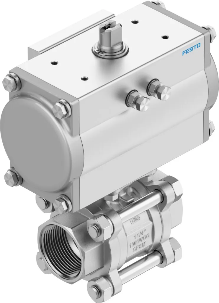 Ball valve actuator unit with double-acting quarter turn actuatorDFPD , Stainless steel ball valve , NAMUR connection pattern for solenoid valves/limit switch attachments to VDI/VDE 3845 , Flow is fully opened or closed in both directions