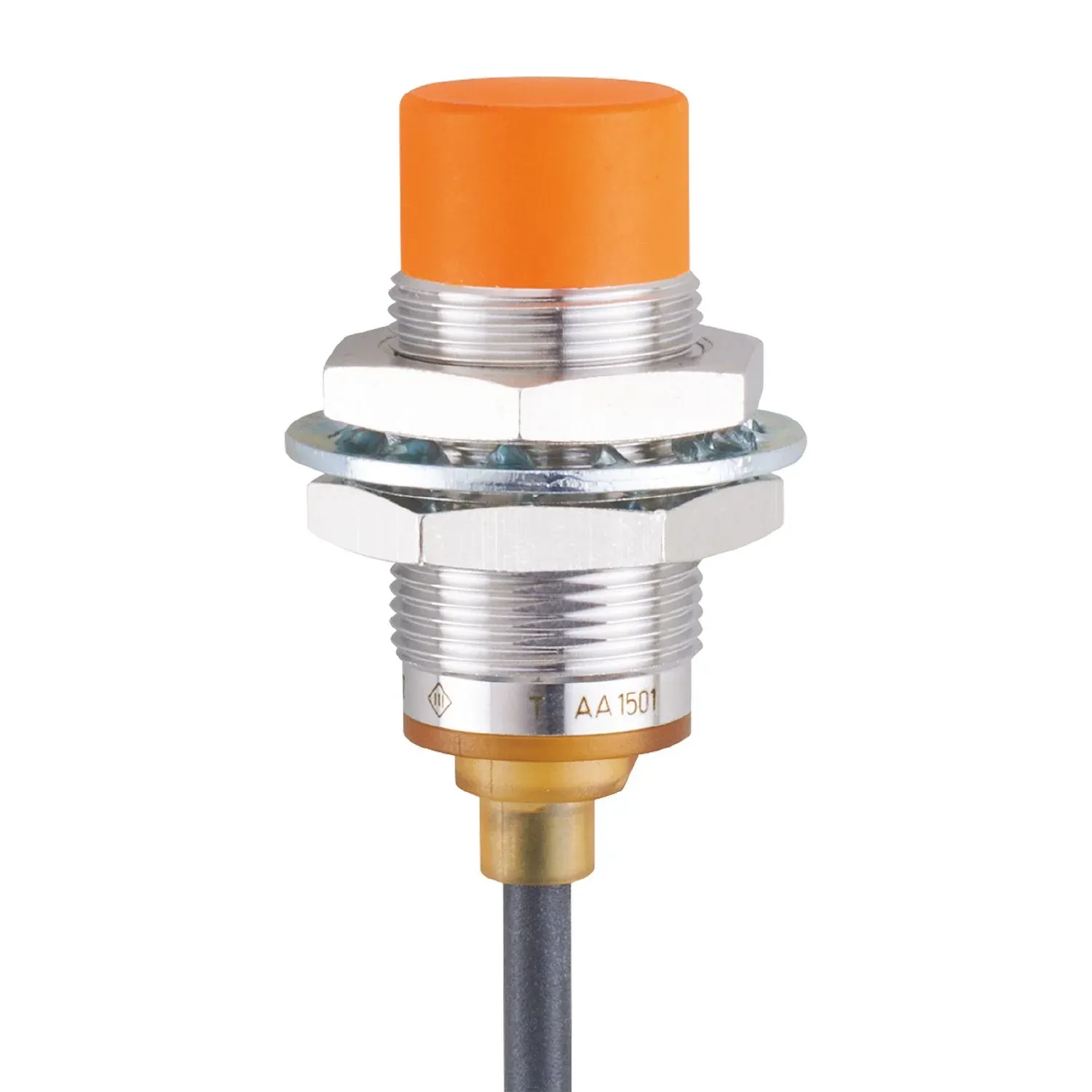 | Materials | brass white bronze coated; sensing face: PBT orange; LED window: PEI; lock nuts: brass white bronze coated |