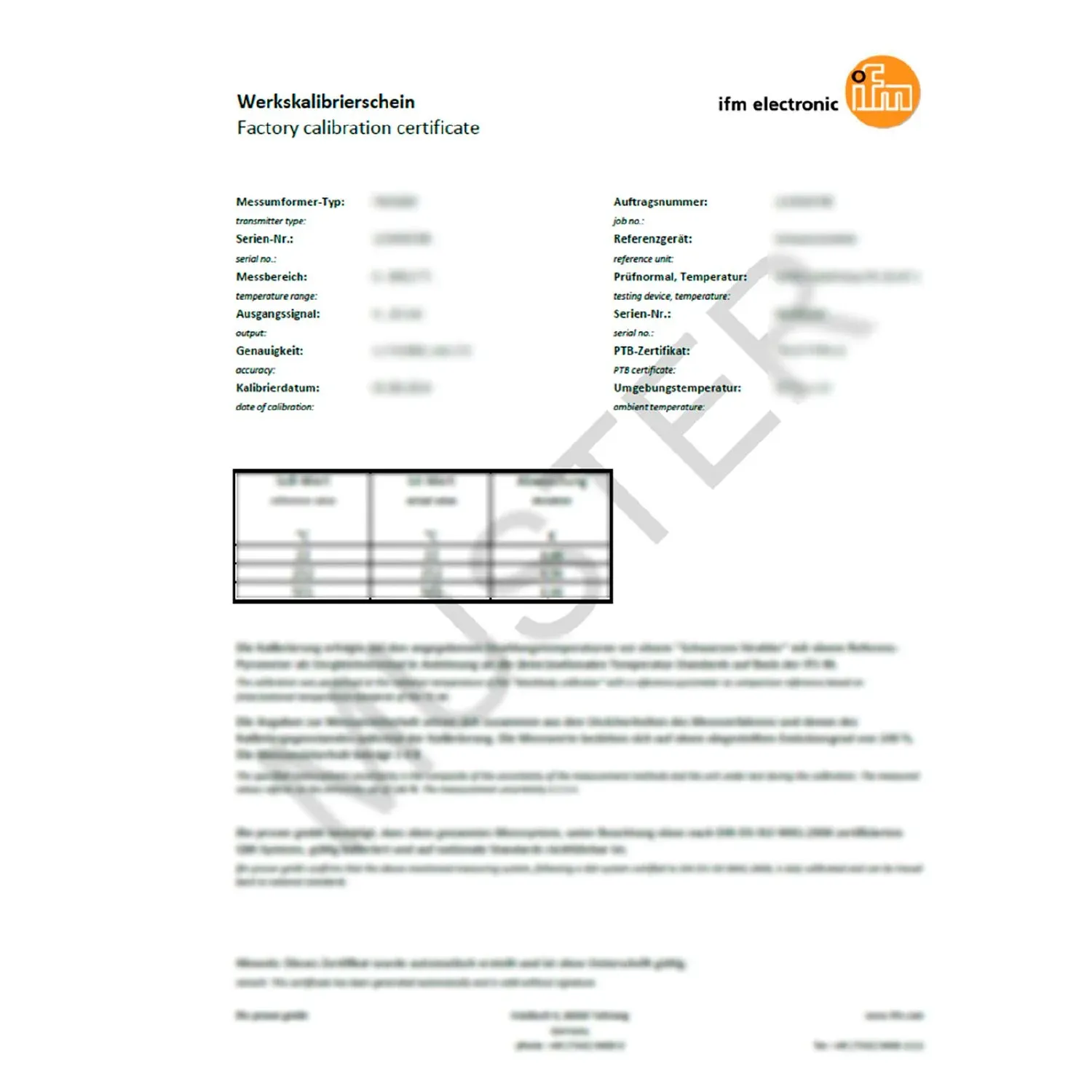 | Remarks | the ISO calibration certificate is not recognised according to the EA MLA (Multilateral Agreement) and is therefore considered as not traced. The calibration certificate must be ordered in conjunction with a sensor. The corresponding sensor is delivered along with the calibration certificate. The calibration certificate is in two languages (German/English). Subsequent orders are only possible if the sensor is in a clean condition upon return. In the internet version of the data sheet a sample certificate is stored in the tab "Downloads". |