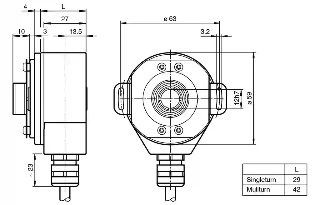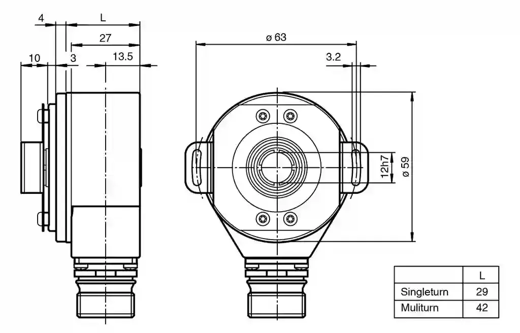 Singleturn absolute rotary encoder. Industrial standard housing ∅58 mm, 16 Bit singleturn, Data transfer up to 2 MBaud, Optically isolated RS 422 interface, Zero-set function, Enclosure type: 58 mm, Type of shaft: Hollow shaft, Interface: SSI, Detection type: photoelectric sampling, Interface type: SSI, Input type: Selection of counting direction (cw/ccw). Detection type: photoelectric sampling. Device type: Singleturn absolute rotary encoder. Operating voltage: 4.5 … 30 V DC. No-load supply current: max. 180 mA. Time delay before availability: < 250 ms. Linearity: ± 2 LSB at 16 Bit, ± 1 LSB at 13 Bit, ± 0,5 LSB at 12 Bit. Output code: Gray code, binary code. Code course (counting direction): cw descending (clockwise rotation, code course descending). Interface type: SSI. Monoflop time: 20 ± 10 µs. Resolution: . Single turnup to 16 BitOverall resolutionup to 16 Bit: . Single turn: up to 16 Bit. Overall resolution: up to 16 Bit. Transfer rate: 0.1 … 2 MBit/s. Voltage drop: UB – 2.5 V. Standard conformity: RS 422. Input type: Selection of counting direction (cw/ccw). Signal voltage: . High4.5 … 30 VLow0 … 2 V: . High: 4.5 … 30 V. Low: 0 … 2 V. Input current: < 6 mA. Switch-on delay: < 10 ms. Input type: zero-set (PRESET 1). Signal voltage: . High4.5 … 30 VLow0 … 2 V: . High: 4.5 … 30 V. Low: 0 … 2 V. Input current: < 6 mA. Signal duration: min. 100 ms. Switch-on delay: < 10 ms. Connector: type 9416 (M23), 12-pin, type 9416L (M23), 12-pin. Cable: ∅7 mm, 6 x 2 x 0.14 mm2, 1 m. Degree of protection: DIN EN 60529, IP65. Climatic testing: DIN EN 60068-2-3, no moisture condensation. Emitted interference: EN 61000-6-4:2007. Noise immunity: EN 61000-6-2:2005. Shock resistance: DIN EN 60068-2-27, 100 g, 6 ms. Vibration resistance: DIN EN 60068-2-6, 20 g, 10 … 2000 Hz. UL approval: cULus Listed, General Purpose, Class 2 Power Source. Operating temperature: -40 … 85 °C (-40 … 185 °F). Storage temperature: -40 … 85 °C (-40 … 185 °F). Material: . Combination 1housing: aluminum Flange: aluminum Shaft: stainless steel: . Combination 1: housing: aluminum Flange: aluminum Shaft: stainless steel. Mass: approx. 300 g (combination 1). Rotational speed: max. 3000 min -1. Moment of inertia: 30 gcm2. Starting torque: < 3 Ncm. Shaft load: . Angle offset± 0.9 °Axial offsetstatic: ± 0.3 mm, dynamic: ± 0.1 mmRadial offsetstatic: ± 0.5 mm, dynamic: ± 0.2 mm: . Angle offset: ± 0.9 °. Axial offset: static: ± 0.3 mm, dynamic: ± 0.1 mm. Radial offset: static: ± 0.5 mm, dynamic: ± 0.2 mm. Dimensions: . Length36 mmDiameter59 mm: . Length: 36 mm. Diameter: 59 mm