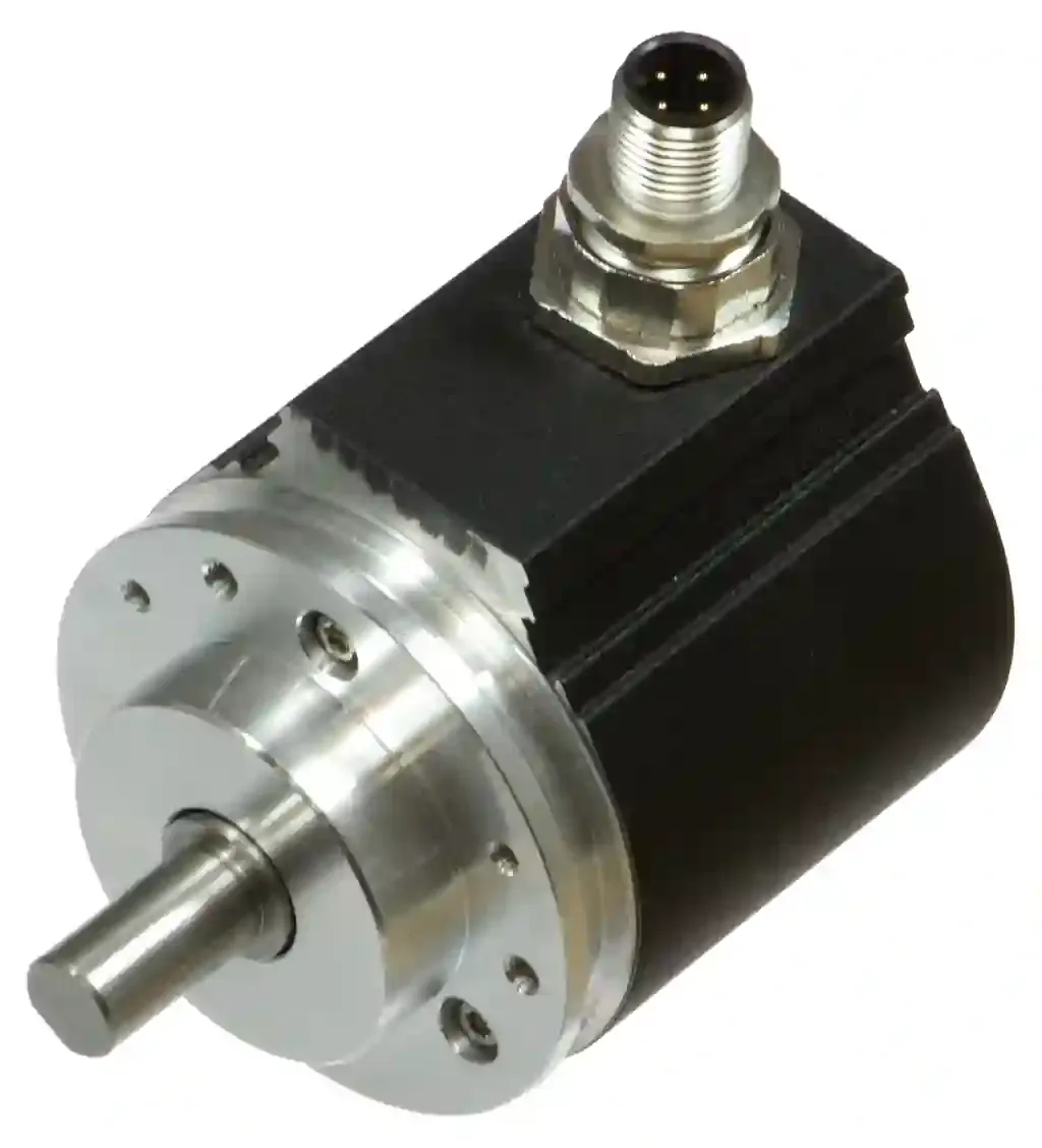 Multiturn absolute rotary encoder. Industrial standard housing ∅58 mm, 16 Bit multiturn, Output code: gray and binary, Transfer of position data with 4 AS-Interface slaves, Parameterization and addressing via AS-Interface, Enclosure type: 58 mm, Type of shaft: Solid shaft, Interface: AS-Interface, Detection type: photoelectric sampling, Interface type: AS-Interface. Detection type: photoelectric sampling. Device type: Multiturn absolute rotary encoder. Operating voltage: 29.5 … 31.6 V DC. No-load supply current: max. starting current 155 mA , operating current max. 85 mA. Linearity: ± 1 LSB. Output code: programmable, Gray code, binary code. Code course (counting direction): programmable,cw ascending (clockwise rotation, code course ascending)cw descending (clockwise rotation, code course descending). Interface type: AS-Interface. Resolution: . Overall resolutionSee table, max. 16 Bit: . Overall resolution: See table, max. 16 Bit. Transfer rate: max. 0.167 MBit/s. Standard conformity: AS-Interface. Connector: type V1, M12, 4-pin. Degree of protection: DIN EN 60529, IP65. Climatic testing: DIN EN 60068-2-3, no moisture condensation. Emitted interference: EN 61000-6-4:2007. Noise immunity: EN 61000-6-2:2005. Shock resistance: DIN EN 60068-2-27, 100 g, 11 ms. Vibration resistance: DIN EN 60068-2-6, 10 g, 10 … 2000 Hz. Operating temperature: -20 … 70 °C (-4 … 158 °F). Storage temperature: -25 … 85 °C (-13 … 185 °F). Material: housing: powder coated aluminumflange: aluminumshaft: stainless steel. Mass: approx. 360 g. Rotational speed: max. 6000 min -1. Moment of inertia: 30 gcm2. Starting torque: ≤ 2 Ncm. Shaft load: . Axial40 NRadial60 N: . Axial: 40 N. Radial: 60 N. Dimensions: . Diameter58 mm: . Diameter: 58 mm