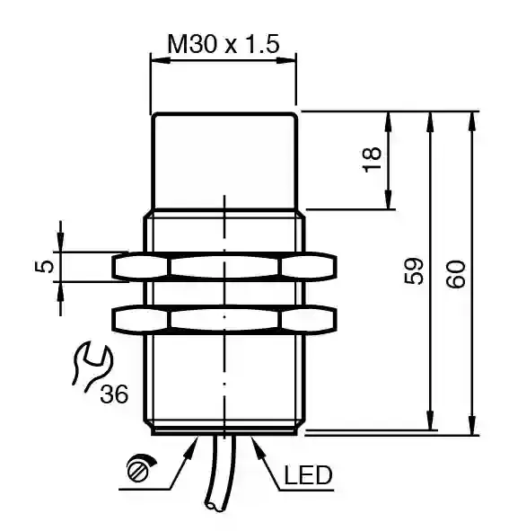 Capacitive sensor. Switching function: Normally open (NO), Output type: PNP, Installation: non-flush, Output polarity: DC, Output type: 3-wire, Thread mold: M30, Construction type: Cylindrical, thread, Series: Cylindrical type, Operating voltage: 10 … 60 V DC, Potentiometer: sensitivity adjustment, Type of voltage: DC, Connection type: cable, Housing material: Stainless steel 1.4305 / AISI 303, Degree of protection: IP67. Switching function: Normally open (NO). Output type: PNP. Rated operating distance: 15 mm. Installation: non-flush. Output polarity: DC. Assured operating distance: 0 … 12.1 mm. Output type: 3-wire. Installation conditions: . A18 mmB10 mmC30 mmF60 mm: . A: 18 mm. B: 10 mm. C: 30 mm. F: 60 mm. Operating voltage: 10 … 60 V DC. Switching frequency: 0 … 10 Hz. Reverse polarity protection: reverse polarity protected. Short-circuit protection: pulsing. Voltage drop: ≤ 2.8 V. Operating current: 0 … 200 mA. Off-state current: 0 … 0.5 mA typ. 0.1 µA at 25 °C. Off-state current TU =40 °C, switching element off≤ 100 µA: . Off-state current TU =40 °C, switching element off: ≤ 100 µA. No-load supply current: ≤ 20 mA. Time delay before availability: ≤ 50 ms. Switching state indicator: LED, yellow. MTTFd: 750 a. Mission Time (TM): 20 a. Diagnostic Coverage (DC): 0 %. Potentiometer: sensitivity adjustment. Standard conformity: . StandardsEN IEC 60947-5-2: . Standards: EN IEC 60947-5-2. UL approval: cULus Listed Load Type: General Purpose Enclosure Type Rating: Type 1. CCC approval: Certified by China Compulsory Certification (CCC). Ambient temperature: -25 … 70 °C (-13 … 158 °F). Storage temperature: -40 … 85 °C (-40 … 185 °F). Connection type: cable. Housing material: Stainless steel 1.4305 / AISI 303. Sensing face: PBT. Degree of protection: IP67. Cable: . Wire end ferrulesyesCable diameter6.4 mm ± 0.2 mmBending radius> 10 x cable diameterMaterialPVCColorgreyNumber of cores3Core cross section0.75 mm2LengthL2 m: . Wire end ferrules: yes. Cable diameter: 6.4 mm ± 0.2 mm. Bending radius: > 10 x cable diameter. Material: PVC. Color: grey. Number of cores: 3. Core cross section: 0.75 mm2. Length: 2 m. Dimensions: . Length60 mmDiameter30 mm: . Length: 60 mm. Diameter: 30 mm