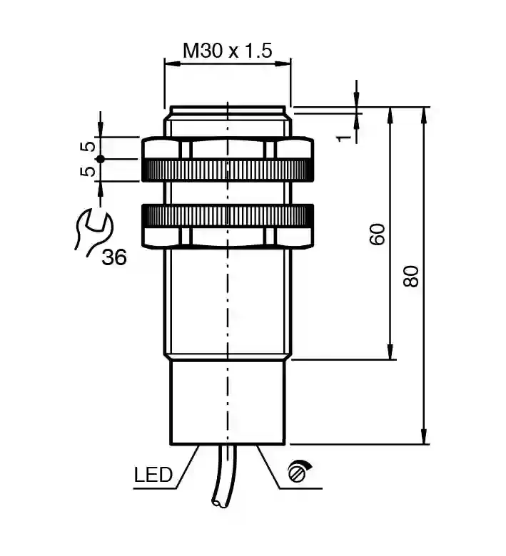 Capacitive sensor. Switching function: Normally closed (NC), Output type: Two-wire, Installation: non-flush, Output polarity: AC, Output type: 2-wire, Thread mold: M30, Construction type: Cylindrical, thread, Series: Cylindrical type, Operating voltage: 20 … 253 V AC 1), Potentiometer: sensitivity adjustment, Type of voltage: AC, Connection type: cable, Housing material: PBT, Degree of protection: IP67. Switching function: Normally closed (NC). Output type: Two-wire. Rated operating distance: 10 mm. Installation: non-flush. Output polarity: AC. Assured operating distance: 0 … 7.2 mm. Output type: 2-wire. Installation conditions: . A18 mmB10 mmC20 mmF60 mm: . A: 18 mm. B: 10 mm. C: 20 mm. F: 60 mm. Operating voltage: 20 … 253 V AC 1). Switching frequency: 0 … 10 Hz. Hysteresis: 2 … 10 % typ. 5 %. Reverse polarity protection: reverse polarity tolerant. Voltage drop at IL: . Voltage drop IL = 100 mA, switching element onUdtyp. 7 V: Ud. Voltage drop IL = 100 mA, switching element on: typ. 7 V. Momentary current(20 ms, 0.1 Hz): 0 … 1200 mA. Rated insulation voltage: 1500 V. Operating current: 5 … 200 mA. Lowest operating current: 5 mA. Off-state current: 0.7 … 1.5 mA typ.. Time delay before availability: ≤ 300 ms. Switching state indicator: LED, yellow. Potentiometer: sensitivity adjustment. Standard conformity: . StandardsEN IEC 60947-5-2: . Standards: EN IEC 60947-5-2. UL approval: cULus Listed Load Type: General Purpose Enclosure Type Rating: Type 1. CCC approval: Certified by China Compulsory Certification (CCC). Ambient temperature: -25 … 70 °C (-13 … 158 °F). Storage temperature: -25 … 85 °C (-13 … 185 °F). Connection type: cable. Housing material: PBT. Sensing face: PBT. Degree of protection: IP67. Cable: . Wire end ferrulesyesCable diameter6 mm ± 0.2 mmBending radius> 10 x cable diameterMaterialPVCColorgreyNumber of cores2Core cross section0.75 mm2LengthL2 m: . Wire end ferrules: yes. Cable diameter: 6 mm ± 0.2 mm. Bending radius: > 10 x cable diameter. Material: PVC. Color: grey. Number of cores: 2. Core cross section: 0.75 mm2. Length: 2 m. Dimensions: . Length80 mmDiameter30 mm: . Length: 80 mm. Diameter: 30 mm. Note: 1) In the temperature range below 0 °C, permissible operating voltage Ub 80…253 V Safety fuse ≤ 0.8 A (quick-blow) according to IEC 60127-2 Sheet 1 Recommendation: after a short circuit, check that the device is functioning correctly.