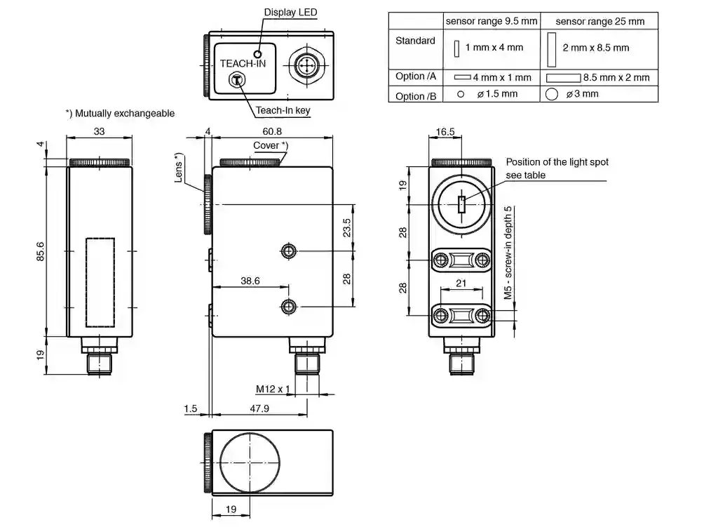Print mark color sensor. Print mark color sensor, 25 mm detection range, RGB light with rectangular light spot, external Teach-In, Teach-In button, NPN output, PNP output, M12 plug, Diffuse mode sensor for recording colored print marks on backgrounds with different colors, Teach-in procedure for automatic threshold value setting, 3 emitter colors: green, red and blue, Very short response time, Optical system exchangeable by 90°. Sensor range: 25 mm ± 4mm. Light source: 3 LEDs (R,G,B). Light type: Visible green/red/blue, modulated light. Light spot representation: rectangular 2 mm x 8.5 mm. Angle deviation: max. ± 3°. MTTFd: 650 a. Mission Time (TM): 20 a. Diagnostic Coverage (DC): 0 %. Function indicator: LED yellow, lights up if print mark is detectedflashes, if no safe operation is possible. Control elements: Teach-In key. Operating voltage: 10 … 30 V DC. Ripple: 10 %. No-load supply current: ≤ 55 mA. Function input: Teach-In input. Switching type: PNP switches according to +UB, NPN according to 0 V for detected mark. Signal output: 1 PNP and 1 NPN short-circuit protected, open collector, synchronized-switching. Switching voltage: PNP: ≥ (+UB -2.5 V) , NPN: ≤ 1.5 V. Switching current: max. 200 mA. Switching frequency: 1.65 kHz. Response time: 300 µs. Product standard: EN 60947-5-2. CCC approval: CCC approval / marking not required for products rated ≤36 V. Approvals: CE. Ambient temperature: -20 … 60 °C (-4 … 140 °F). Storage temperature: -20 … 75 °C (-4 … 167 °F). Degree of protection: IP67. Connection: 5-pin, M12 x 1 connector. Material: . HousingPC (glass-fiber-reinforced Makrolon)Optical faceglass: . Housing: PC (glass-fiber-reinforced Makrolon). Optical face: glass. Mass: 200 g. Dimensions: . Height85.5 mmWidth33 mmDepth60.8 mm: . Height: 85.5 mm. Width: 33 mm. Depth: 60.8 mm