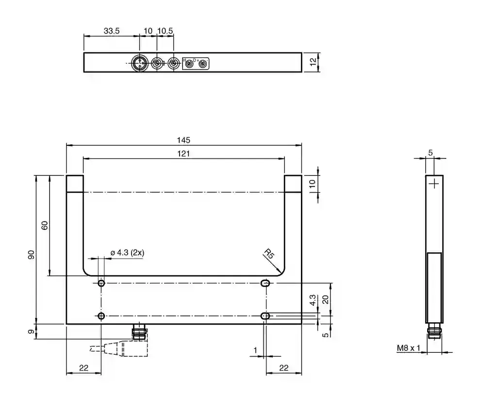 Photoelectric slot sensor. Photoelectric slot sensor, zinc pressure diecast housing, 121 mm slot width, red light, light/dark on, sensitivity adjuster, DC version, NPN output, 3-pin M8 plug, Optimized for the detection of small parts, High switching frequency, Multiple device installation possible, no mutual interference (no cross-talk), Sensitivity adjuster and light-on/dark-on changeover switch as standard features of this series, Visible red light. Light source: LED. Light type: modulated visible red light. Target size: 0.3 mm. Slot width: 121 mm. Slot depth: 60 mm. Ambient light limit: 100000 Lux. MTTFd: 1290 a. Mission Time (TM): 20 a. Diagnostic Coverage (DC): 0 %. Function indicator: LED red in connector. Control elements: Sensitivity adjuster, light/dark switch. Operating voltage: 10 … 30 V DC. Ripple: 10 %. No-load supply current: ≤ 15 mA. Switching type: light/dark on. Signal output: 1 NPN, short-circuit protected open collector. Switching voltage: max. 30 V DC. Switching current: max. 100 mA. Repeat accuracy: 0.05 mm. Switching frequency: 3 kHz. Response time: ≤ 160 µs. Product standard: EN 60947-5-2. CE conformity: CE. UL approval: cULus Listed, Class 2 Power Source, Type 1 enclosure. CCC approval: CCC approval / marking not required for products rated ≤36 V. Ambient temperature: -20 … 60 °C (-4 … 140 °F). Storage temperature: -20 … 75 °C (-4 … 167 °F). Degree of protection: IP67. Connection: M8 connector, 3-pin. Material: . Housingpowder coated diecast zincOptical faceglass: . Housing: powder coated diecast zinc. Optical face: glass. Mass: 295 g. Dimensions: . Height145 mmWidth12 mmLength90 mm: . Height: 145 mm. Width: 12 mm. Length: 90 mm