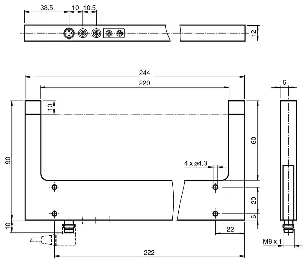 Photoelectric slot sensor. Photoelectric slot sensor, aluminum housing, 220 mm slot width, red light, light/dark on, sensitivity adjuster, DC version, NPN output, 3-pin M8 plug, Optimized for the detection of small parts, High switching frequency, Multiple device installation possible, no mutual interference (no cross-talk), Sensitivity adjuster and light-on/dark-on changeover switch as standard features of this series, Visible red light. Light source: LED. Light type: modulated visible red light. Target size: 0.5 mm. Slot width: 220 mm. Slot depth: 60 mm. Ambient light limit: 100000 Lux. MTTFd: 1290 a. Mission Time (TM): 20 a. Diagnostic Coverage (DC): 0 %. Function indicator: LED red in connector. Control elements: Sensitivity adjuster, light/dark switch. Operating voltage: 10 … 30 V DC. Ripple: 10 %. No-load supply current: ≤ 15 mA. Switching type: light/dark on. Signal output: 1 NPN, short-circuit protected open collector. Switching voltage: max. 30 V DC. Switching current: max. 100 mA. Repeat accuracy: 0.05 mm. Switching frequency: 3 kHz. Response time: ≤ 160 µs. Product standard: EN 60947-5-2. CE conformity: CE. UL approval: cULus Listed, Class 2 Power Source, Type 1 enclosure. Ambient temperature: -20 … 60 °C (-4 … 140 °F). Storage temperature: -20 … 75 °C (-4 … 167 °F). Degree of protection: IP67. Connection: M8 connector, 3-pin. Material: . Housingblack anodized aluminumOptical faceglass: . Housing: black anodized aluminum. Optical face: glass. Mass: 240 g. Dimensions: . Height244 mmWidth12 mmLength90 mm: . Height: 244 mm. Width: 12 mm. Length: 90 mm