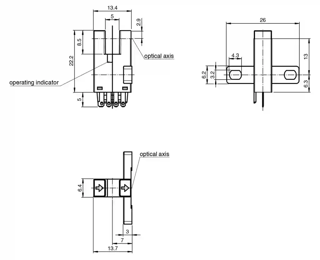 Photoelectric slot sensor. Miniature photoelectric slot sensor for the detection of small parts, T design, fork width 5 mm, infrared light, NPN outputs, flat connector, Miniature design, Optimized for the detection of small parts, High switching frequency, Simple and fast mounting, Clearly visible LED functional display. Light source: IRED. Light type: Infrared, continuous light , 940 nm. Target size: 0.8 x 1.8 mm. Slot width: 5 mm. Slot depth: 8.5 mm. Ambient light limit: 1000 Lux. MTTFd: 3760 a. Mission Time (TM): 20 a. Diagnostic Coverage (DC): 0 %. Function indicator: red LED lights up when receiving the light beam. Operating voltage: 5 … 24 V DC , class 2. No-load supply current: max. 20 mA. Time delay before availability: < 2 ms. Switching type: light/dark on. Signal output: 2 NPN complementary , overvoltage protected. Switching voltage: max. 30 V DC. Switching current: max. 50 mA , resistive load. Voltage drop: max. 0.2 V at 10 mA max. 0.6 V at 50 mA. Switching frequency: max. 5 kHz. Response time: 40 µs Light beam is not interrupted 80 µs Light beam is interrupted. Repeat accuracy: 0.03 mm. Directive conformity: . EMC Directive 2004/108/ECEN 60947-5-2:2007+A1:2012: . EMC Directive 2004/108/EC: EN 60947-5-2:2007+A1:2012. Standard conformity: . StandardsUL 60947-5-2: . Standards: UL 60947-5-2. EAC conformity: TR CU 020/2011. UL approval: cULus Recognized, Class 2 Power Source. CCC approval: CCC approval / marking not required for products rated ≤36 V. Ambient temperature: -25 … 55 °C (-13 … 131 °F). Storage temperature: -30 … 80 °C (-22 … 176 °F). Pollution degree: 2. Degree of protection: IP50. Connection: 4-pin flat connector. Material: . HousingPBT: . Housing: PBT. Mass: 3 g. Tightening torque, fastening screws: 0.6 Nm. Dimensions: . Height13.4 mmWidth26 mmLength27.2 mm: . Height: 13.4 mm. Width: 26 mm. Length: 27.2 mm