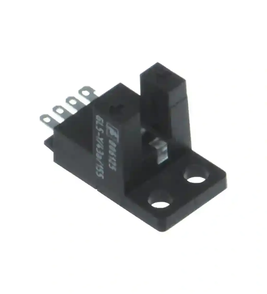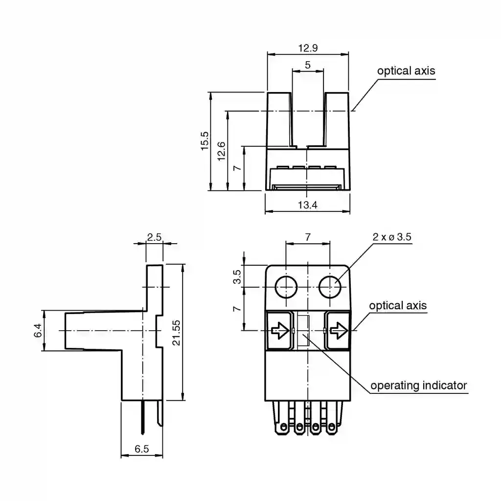 Photoelectric slot sensor. Miniature photoelectric slot sensor for the detection of small parts, Y design, fork width 5 mm, infrared light, NPN outputs, flat connector, Miniature design, Optimized for the detection of small parts, High switching frequency, Simple and fast mounting, Clearly visible LED functional display. Light source: IRED. Light type: Infrared, continuous light , 940 nm. Target size: 0.8 x 1.8 mm. Slot width: 5 mm. Slot depth: 8.5 mm. Ambient light limit: 1000 Lux. MTTFd: 3760 a. Mission Time (TM): 20 a. Diagnostic Coverage (DC): 0 %. Function indicator: red LED lights up when receiving the light beam. Operating voltage: 5 … 24 V DC , class 2. No-load supply current: max. 20 mA. Time delay before availability: < 2 ms. Switching type: light/dark on. Signal output: 2 NPN complementary , overvoltage protected. Switching voltage: max. 30 V DC. Switching current: max. 50 mA , resistive load. Voltage drop: max. 0.2 V at 10 mA max. 0.6 V at 50 mA. Switching frequency: max. 5 kHz. Response time: 40 µs Light beam is not interrupted 80 µs Light beam is interrupted. Repeat accuracy: 0.03 mm. Directive conformity: . EMC Directive 2004/108/ECEN 60947-5-2:2007+A1:2012: . EMC Directive 2004/108/EC: EN 60947-5-2:2007+A1:2012. Standard conformity: . StandardsUL 60947-5-2: . Standards: UL 60947-5-2. UL approval: cULus Recognized, Class 2 Power Source. CCC approval: CCC approval / marking not required for products rated ≤36 V. Ambient temperature: -25 … 55 °C (-13 … 131 °F). Storage temperature: -30 … 80 °C (-22 … 176 °F). Pollution degree: 2. Degree of protection: IP50. Connection: 4-pin flat connector. Material: . HousingPBT: . Housing: PBT. Mass: 3 g. Tightening torque, fastening screws: 0.6 Nm. Dimensions: . Height13.4 mmWidth26.55 mmLength15.5 mm: . Height: 13.4 mm. Width: 26.55 mm. Length: 15.5 mm