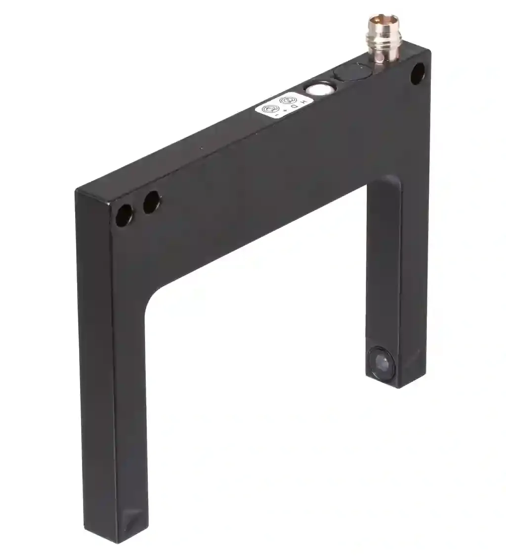 Photoelectric slot sensor. Photoelectric slot sensor, zinc pressure diecast housing, 80 mm slot width, red light, light/dark on, sensitivity adjuster, DC version, NPN output, 3-pin M8 plug, Optimized…