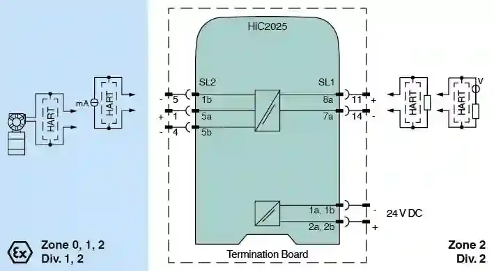 SMART Transmitter Power Supply. 1-channel isolated barrier, 24 V DC supply (bus powered), Input for 2-wire SMART transmitters and current sources, Output for 4 mA … 20 mA or 1 V … 5 V, Low power dissipation, Up to SIL 2 (SC 3) acc. to IEC/EN 61508, Housing width: 12.5 mm, Number of channels: 1-channel, HART communication, Safety Integrity Level (SIL): SIL 2, Systematic capability (SC): SC 3, Rated voltage: 19 … 30 V DC bus powered via Termination Board, Field device: 2-wire transmitter, Field device [2]: current source. Signal type: Analog input. Safety Integrity Level (SIL): SIL 2. Systematic capability (SC): SC 3. Connection: SL1: 1a, 1b(-); 2a, 2b(+). Rated voltage: 19 … 30 V DC bus powered via Termination Board. Ripple: ≤ 10 %. Rated current: ≤ 45 mA at 24 V and 20 mA source mode output. Power dissipation: ≤ 800 mW. Power consumption: ≤ 1.1 W. Connection side: field side. Connection: SL2: 5a(+), 1b(-); 5a(+), 5b(-). Input signal: 4 … 20 mA limited to approx. 26 mA. Voltage drop: approx. 5 V on SL2: 5a(+), 1b(-). Available voltage: ≥ 15 V at 20 mA , ≥ 18 V at 4 mA on SL2: 5a(+), 5b(-). Connection side: control side. Connection: SL1: 8a(+), 7a(-). Load: 0 … 350 Ω (source mode). Output signal: source mode: 4 … 20 mA or 1 … 5 V (internal resistor: 250 Ω, 0.1 %) sink mode: 4 … 20 mA, operating voltage 10 … 30 V For additional internal or external loads the voltage drop has to be considered, e. g. 250 Ω x 20 mA = 5 V.. Ripple: 20 mV rms. Deviation: at 20 °C (68 °F) < 0.1 % of full scale, incl. non-linearity and hysteresis (source mode and sink mode 4 … 20 mA) ≤ ± 0.2 % incl. non-linearity and hysteresis (source mode 1 … 5 V). Influence of ambient temperature< 2 µA/K (-20 … 70 °C (-4 … 158 °F)); < 4 µA/K (-40 … -20 °C (-40 … -4 °F)) (source mode and sink mode 4 … 20mA)< 0.5 mV/K (-20 … 70 °C (-4 … 158 °F)); < 1 mV/K (-40 … -20 °C (-40 … -4 °F)) (source mode 1…5 V): . Influence of ambient temperature: < 2 µA/K (-20 … 70 °C (-4 … 158 °F)); < 4 µA/K (-40 … -20 °C (-40 … -4 °F)) (source mode and sink mode 4 … 20mA)< 0.5 mV/K (-20 … 70 °C (-4 … 158 °F)); < 1 mV/K (-40 … -20 °C (-40 … -4 °F)) (source mode 1…5 V). Frequency range: field side into the control side: bandwidth with 0.5 Vpp signal 0 … 3 kHz (-3 dB) control side into the field side: bandwidth with 0.5 Vpp signal 0 … 3 kHz (-3 dB). Settling time: ≤ 50 ms. Rise time/fall time: ≤ 10 ms. Input/Output: safe electrical isolation acc. to IEC/EN 60079-11, voltage peak value 375 V. Input/power supply: safe electrical isolation acc. to IEC/EN 60079-11, voltage peak value 375 V. Output/power supply: basic insulation according to IEC/EN 61010-1, rated insulation voltage 60 Veff. Display elements: LED. Control elements: DIP switch. Factory setting: output: current source. Configuration: via DIP switches. Labeling: space for labeling at the front. Electromagnetic compatibility: . Directive 2014/30/EUEN 61326-1:2013 (industrial locations): . Directive 2014/30/EU: EN 61326-1:2013 (industrial locations). Electromagnetic compatibility: NE 21:2017 EN 61326-3-2:2018 For further information see system description.. Degree of protection: IEC 60529:2001. Protection against electrical shock: UL 61010-1:2018. Ambient temperature: -40 … 70 °C (-40 … 158 °F). Degree of protection: IP20. Mass: approx. 100 g. Dimensions: 12.5 x 106 x 128 mm (0.5 x 4.2 x 5.1 inch) (W x H x D). Mounting: on termination board. Coding: pin 1 and 3 trimmed For further information see system description.. EU-type examination certificate: CESI 06 ATEX 017. Marking II (1)G [Ex ia Ga] IIC [exsign] II (1)D [Ex ia Da] IIIC [exsign] I (M1) [Ex ia Ma] IInputEx ia: . Marking: II (1)G [Ex ia Ga] IIC [exsign] II (1)D [Ex ia Da] IIIC [exsign] I (M1) [Ex ia Ma] I. Input: Ex ia. Supply: . Maximum safe voltageUm250 V AC (Attention! Um is no rated voltage.): Um. Maximum safe voltage: 250 V AC (Attention! Um is no rated voltage.). Equipment: SL2: 5a(+), 5b(-). VoltageUo25.2 VCurrentIo100 mAPowerPo630 mWInternal capacitanceCi5.7 nFInternal inductanceLinegligible: Uo. Voltage: 25.2 V. Current: 100 mA. Power: 630 mW. Internal capacitance: 5.7 nF. Internal inductance: negligible. Equipment: SL2: 5a(+), 1b(-). VoltageUi30 VCurrentIi128 mAPowerPi1000 mWVoltageUo7.2 VCurrentIo100 mAPowerPo25 mWInternal capacitanceCi5.7 nFInternal inductanceLinegligible: Ui. Voltage: 30 V. Current: 128 mA. Power: 1000 mW. Voltage: 7.2 V. Current: 100 mA. Power: 25 mW. Internal capacitance: 5.7 nF. Internal inductance: negligible. Certificate: CESI 19 ATEX 027 X. Marking II 3G Ex ec IIC T4 Gc: . Marking: II 3G Ex ec IIC T4 Gc. Directive conformity: . Directive 2014/34/EUEN IEC 60079-0:2018 , EN 60079-11:2012 , EN IEC 60079-7:2015/A1:2018: . Directive 2014/34/EU: EN IEC 60079-0:2018 , EN 60079-11:2012 , EN IEC 60079-7:2015/A1:2018. FM approval: . FM certificateFM 19 US 0122 X , FM 19 CA 0065 XControl drawing116-0470 (cFMus): . FM certificate: FM 19 US 0122 X , FM 19 CA 0065 X. Control drawing: 116-0470 (cFMus). UL approval: E106378. Control drawing116-0458 (cULus): . Control drawing: 116-0458 (cULus). IECEx approval: . IECEx certificateIECEx CES 06.0002XIECEx marking[Ex ia Ga] IIC , [Ex ia Da] IIIC , [Ex ia Ma] I Ex ec IIC T4 Gc: . IECEx certificate: IECEx CES 06.0002X. IECEx marking: [Ex ia Ga] IIC , [Ex ia Da] IIIC , [Ex ia Ma] I Ex ec IIC T4 Gc. Supplementary information: Observe the certificates, declarations of conformity, instruction manuals, and manuals where applicable. For information see www.pepperl-fuchs.com.
