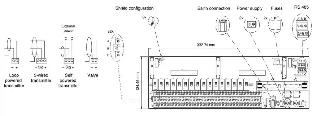 | Connection | field side: fixed screw terminalscontrol side: PCS-specified connectorRS 485 interface: removable screw terminalspower: removable screw terminals |