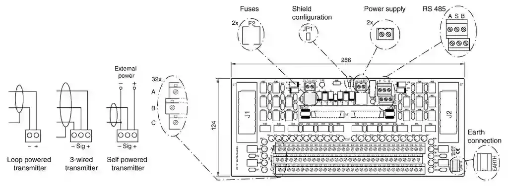 Connectionfield side: screw terminalscontrol side: 56-pin Elco connectorRS 485 interface: removable screw terminalspower: removable screw terminals