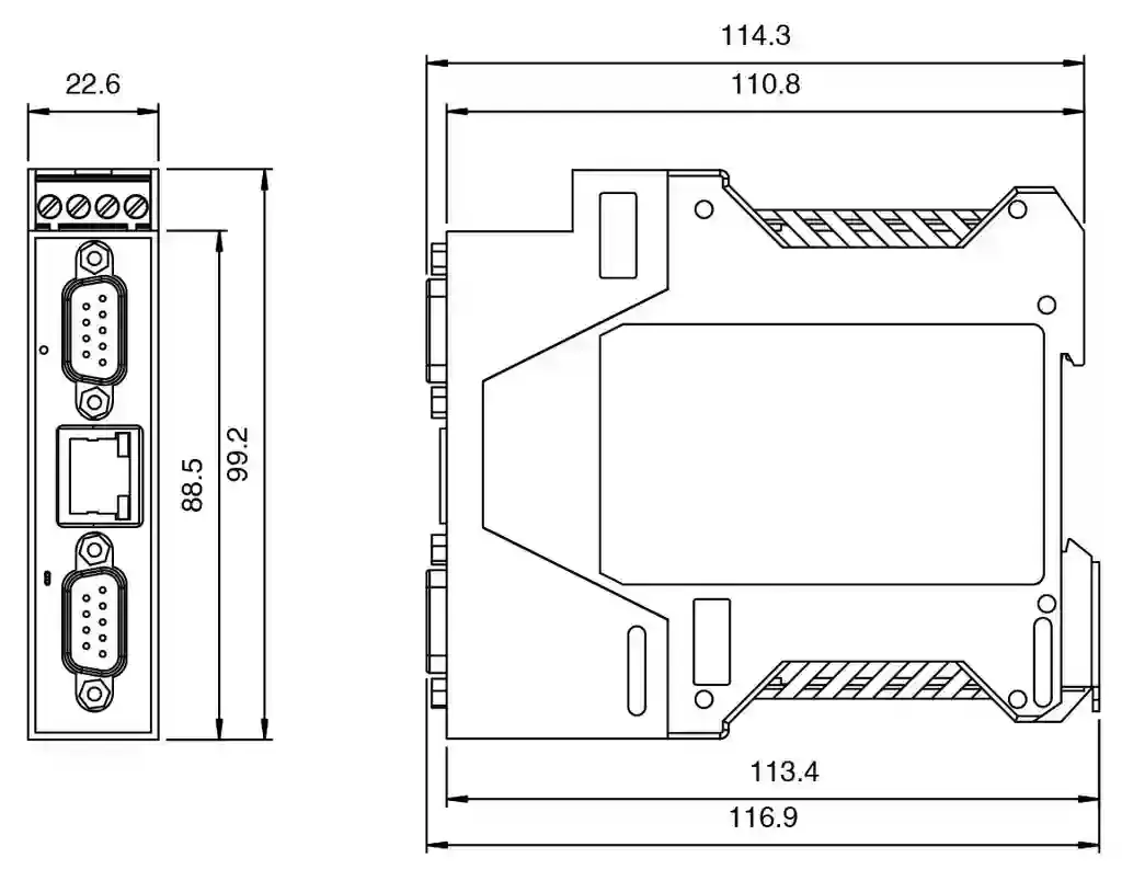PROFINET IO to Modbus Gateway. PROFINET IO to Modbus Gateway 2-port DIN rail DB9. UL File Number: E360395. MTBF: 46.3 a. LED indication: see manual. Rated operating voltage: 5 … 30 V DC. General information: Redundant power. Nominal voltage: 24 V DC. Current consumption: 92 mA. Interface type: Software selectable interfaces: RS-232 , RS-422 , RS-485 (2 and 4-wire). Physical: 2 x DB9. Protocol: MODBUS RTU. Supported baud rates: 300 bps to 230Kbps. Interface type: Industrial Ethernet. Physical: 1 x RJ45. Protocol: PROFINET IO. Additional protocols: ARP, BOOTP, DHCP/RARP, HTTP, HTTPS, SSH, SSL/TLS, ICMP, RFC 1006 (ISO over TCP), SNMP (MIB-II), TCP/IP & UDP socket services, Telnet, and TFTP, and supports IP multicast data transmission. Transfer rate: 10/100 Mbps. Electromagnetic compatibility: . Directive 2014/30/EUEN 61000-6-2:2005 , EN 610006-4:2007 , EN 610006-4/A1:2011: . Directive 2014/30/EU: EN 61000-6-2:2005 , EN 610006-4:2007 , EN 610006-4/A1:2011. RoHS: EN IEC 63000:2018. Degree of protection: NEMA TS2. Electrical safety: CSA C22.2 No. 60950 / UL60950. Emitted interference: EN 61000-6-4, EN 55032, FCC Part 15 Subpart B, ICES-003, AS/NZS CISPR 32. Noise immunity: EN 61000-6-2 , EN 55024. Ambient temperature: -40 … 75 °C (-40 … 167 °F). Storage temperature: -40 … 85 °C (-40 … 185 °F). Relative humidity: max. 95 %. Altitude: 0 … 3048 m. Degree of protection: IP20. Connection: Power Supply: screw terminals Fieldbus: 1 x RJ45 Inputs/outputs: 2 x DB9. Material: . HousingPolyamide, UL94V-0: . Housing: Polyamide, UL94V-0. Mass: 136g. Dimensions: . Height99.1 mmWidth22.9 mmLength116.8 mm: . Height: 99.1 mm. Width: 22.9 mm. Length: 116.8 mm. Construction type: Cabinet module. Mounting: DIN mounting rail