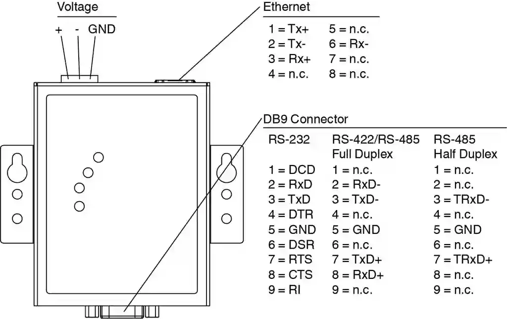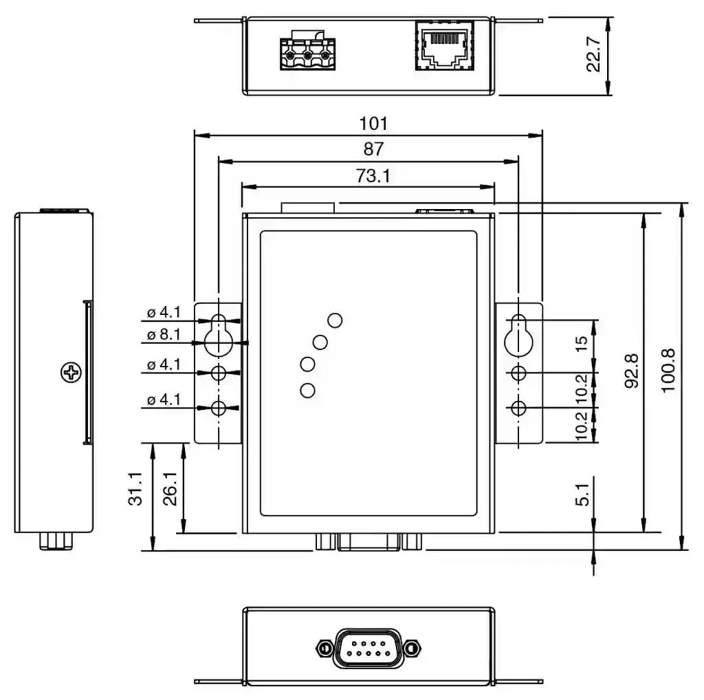 | Connection | Power Supply: pluggable screw terminal Fieldbus: 1 x RJ45 Inputs/outputs: 1 x DB9 |