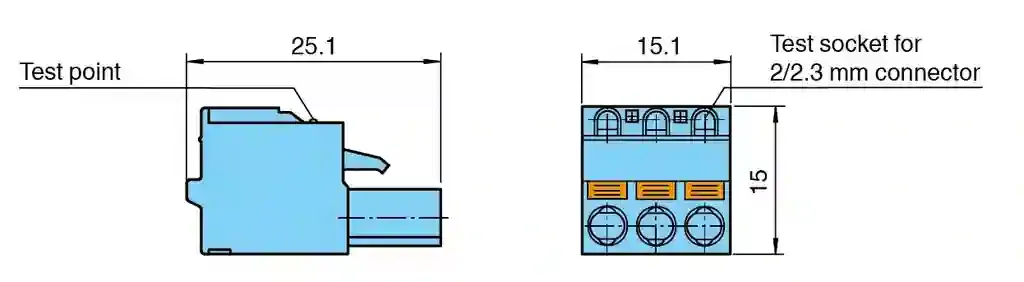 Terminal Block with Test Plug Socket. 3-pin spring terminal with push-in connection technology, For KF modules of K-System, Integrated test sockets for connection of HART communicators, Packaging unit: 5 pieces blue. Number of pins: 3. Core cross section: max. 2.5 mm2. Material: . Colorblue: . Color: blue. Mass: approx. 5 g. Dimensions: 15.1 x 15 x 25.1 mm (0.6 x 0.6 x 1 inch). Construction type: spring terminal with integrated test sockets , removable. Structure: one-rowed. Packing unit: 5 item(s)
