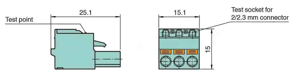 Terminal Block with Test Plug Socket. 3-pin spring terminal with push-in connection technology, For KF modules of K-System, Integrated test sockets for connection of HART communicators, Packaging unit: 5 pieces green. Number of pins: 3. Core cross section: max. 2.5 mm2. Material: . Colorgreen: . Color: green. Mass: approx. 5 g. Dimensions: 15.1 x 15 x 25.1 mm (0.6 x 0.6 x 1 inch). Construction type: spring terminal with integrated test sockets , removable. Structure: one-rowed. Packing unit: 5 item(s)