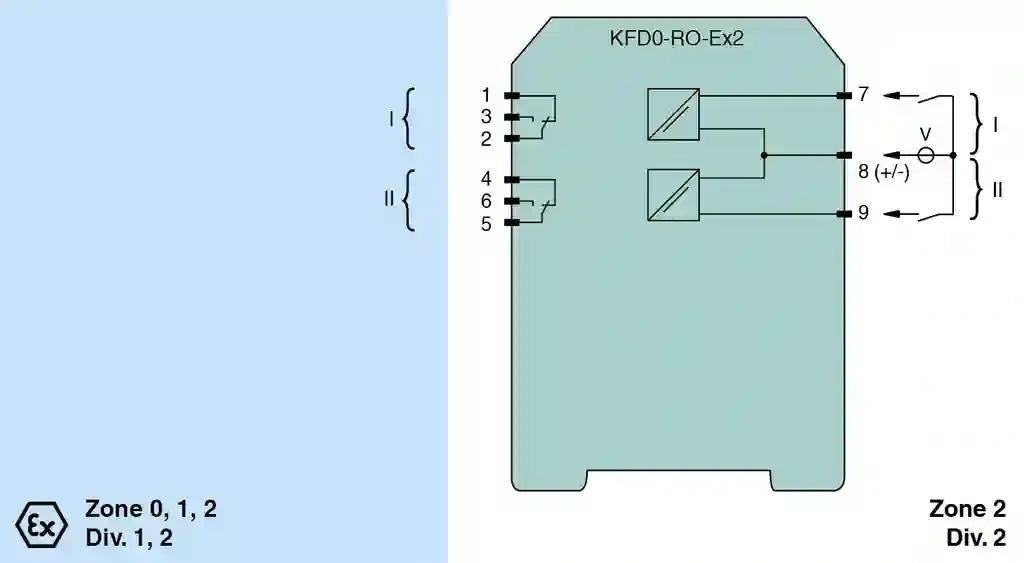Relay Module. 2-channel isolated barrier, 24 V DC supply (loop powered), Logic input 15 V DC … 30 V DC, non-polarized, Relay contact output, Up to SIL 3 acc. to IEC/EN 61508, Housing width: 20 mm, Number of channels: 2-channel, Safety Integrity Level (SIL): SIL 3, Rated voltage: 15 … 30 V DC , loop powered, Type: 2 x logic input, Type: 2 x relay (change-over contact). Signal type: Digital Output. Safety Integrity Level (SIL): SIL 3. Rated voltage: 15 … 30 V DC , loop powered. Power dissipation: 0.8 W. Connection side: control side. Connection: terminals 7, 8, 9. Input voltage: 15 … 30 V DC. Input current: ≤ 21 mA per channel. Safety note: Attention! Combination of output Ex i with output not Ex i is not permitted.If load voltage > 50 V, de-energize before removing the terminals.. Connection side: field side. Connection: terminals 1, 2, 3; 4, 5, 6. Contact loading: 230 V AC/2 A/cos φ > 0.7; 40 V DC/2 A resistive load. Energized/De-energized delay: approx. 10 ms / approx. 5 ms. Mechanical life: 5 x 106 switching cycles. Switching frequency: < 10 Hz. Input/Output: reinforced insulation according to IEC/EN 61010-1, rated insulation voltage 300 Veff. Output/Output: basic insulation according to IEC/EN 61010-1, rated insulation voltage 300 Veff. Display elements: LEDs. Labeling: space for labeling at the front. Electromagnetic compatibility: . Directive 2014/30/EUEN 61326-1:2013 (industrial locations): . Directive 2014/30/EU: EN 61326-1:2013 (industrial locations). Low voltage: . Directive 2014/35/EUEN 61010-1:2010: . Directive 2014/35/EU: EN 61010-1:2010. Electromagnetic compatibility: NE 21:2006. Degree of protection: IEC 60529:2001. Ambient temperature: -20 … 65 °C (-4 … 149 °F). Degree of protection: IP20. Connection: screw terminals. Mass: approx. 100 g. Dimensions: 20 x 119 x 115 mm (0.8 x 4.7 x 4.5 inch) (W x H x D) , housing type B2. Mounting: on 35 mm DIN mounting rail acc. to EN 60715:2001. EU-type examination certificate: DMT 00 ATEX E 016. Marking II (1)G [Ex ia Ga] IIC [exsign] II (1)D [Ex ia Da] IIIC [exsign] I (M1) [Ex ia Ma] IOutputEx iaVoltageUi60 VCurrentIi2 A: . Marking: II (1)G [Ex ia Ga] IIC [exsign] II (1)D [Ex ia Da] IIIC [exsign] I (M1) [Ex ia Ma] I. Output: Ex ia. Voltage: 60 V. Current: 2 A. Input: . Maximum safe voltageUm40 V DC (Attention! Um is no rated voltage.): Um. Maximum safe voltage: 40 V DC (Attention! Um is no rated voltage.). Output: . Contact loading50 V AC/2 A ; 40 V DC/2 A (TÜV 00 ATEX 1621 X): . Contact loading: 50 V AC/2 A ; 40 V DC/2 A (TÜV 00 ATEX 1621 X). Certificate: TÜV 00 ATEX 1621 X. Marking II 3G Ex nA nC IIC T4: . Marking: II 3G Ex nA nC IIC T4. Galvanic isolation: . Input/Outputsafe electrical isolation acc. to IEC/EN 60079-11, voltage peak value 375 VOutput/Outputsafe electrical isolation acc. to IEC/EN 60079-11, voltage peak value 60 V: . Input/Output: safe electrical isolation acc. to IEC/EN 60079-11, voltage peak value 375 V. Output/Output: safe electrical isolation acc. to IEC/EN 60079-11, voltage peak value 60 V. Directive conformity: . Directive 2014/34/EUEN IEC 60079-0:2018+AC:2020 , EN 60079-11:2012 , EN 60079-15:2010: . Directive 2014/34/EU: EN IEC 60079-0:2018+AC:2020 , EN 60079-11:2012 , EN 60079-15:2010. FM approval: . Control drawing116-0261: . Control drawing: 116-0261. CSA approval: . Control drawing116-0156: . Control drawing: 116-0156. IECEx approval: . IECEx certificateIECEx BVS 10.0025IECEx marking[Ex ia Ga] IIC , [Ex ia Da] IIIC , [Ex ia Ma] I: . IECEx certificate: IECEx BVS 10.0025. IECEx marking: [Ex ia Ga] IIC , [Ex ia Da] IIIC , [Ex ia Ma] I. Supplementary information: Observe the certificates, declarations of conformity, instruction manuals, and manuals where applicable. For information see www.pepperl-fuchs.com.
