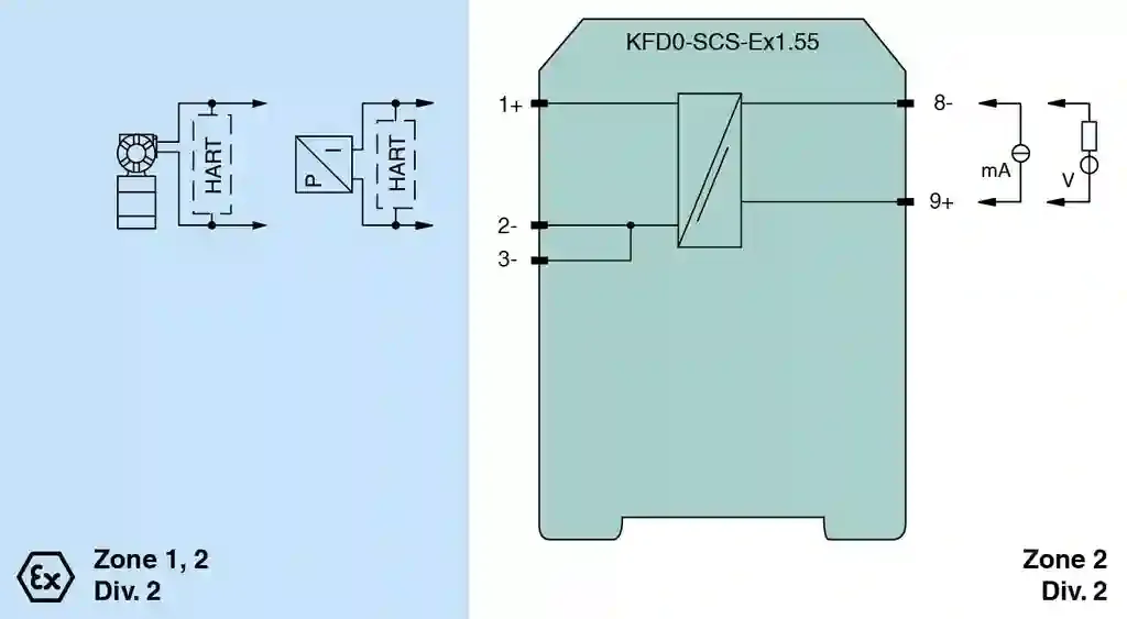 SMART Current Driver/Repeater. 1-channel isolated barrier, 24 V DC supply (loop powered), Current input/output 4 mA … 20 mA, HART-IP or transmitter power supply, Low voltage drop, Line fault detection (LFD), Up to SIL 2 acc. to IEC/EN 61508, Housing width: 20 mm, Number of channels: 1-channel, HART communication, Safety Integrity Level (SIL): SIL 2, Rated voltage: < 30 V DC , loop powered. Signal type: Analog input/analog output. Safety Integrity Level (SIL): SIL 2. Rated voltage: < 30 V DC , loop powered. Power dissipation: 0.2 W. Connection: terminals 8-, 9+. Voltage: max. 30 V DC. Current: 4 … 20 mA (quiescent current < 0.5 mA). Power dissipation: 150 mW at 20 mA and Uin 21 V. Current: 4 … 20 mA (linear transmission 1 … 22 mA). Load: ≤ 800 Ω (at 20 mA). Voltage drop: see note. Deviation: . After calibration≤ ± 80 µA linearity, load and voltage dependence at 20 °C (68 °F): . After calibration: ≤ ± 80 µA linearity, load and voltage dependence at 20 °C (68 °F). Influence of ambient temperature: < 0.5 µA/K. Damping: approx. 3 dB. Rise time: ≤ 20 µs at 0 Ω, ≤ 600 µs with 800 Ω load. Input/Output: safe electrical isolation acc. to IEC/EN 60079-11, voltage peak value 375 V. Labeling: space for labeling at the front. Electromagnetic compatibility: . Directive 2014/30/EUEN 61326-1:2013 (industrial locations): . Directive 2014/30/EU: EN 61326-1:2013 (industrial locations). Electromagnetic compatibility: NE 21:2007. Degree of protection: IEC 60529:2001. Ambient temperature: -20 … 60 °C (-4 … 140 °F). Degree of protection: IP20. Connection: screw terminals. Mass: approx. 120 g. Dimensions: 20 x 124 x 115 mm (0.8 x 4.9 x 4.5 inch) (W x H x D) , housing type B2. Height112 mmWidth20 mmDepth115 mm: . Height: 112 mm. Width: 20 mm. Depth: 115 mm. Mounting: on 35 mm DIN mounting rail acc. to EN 60715:2001. EU-type examination certificate: PTB 02 ATEX 2064. Marking II (2)G [Ex ib Gb] IICVoltageUo23.1 V DCCurrentIo28 mAPowerPo0.647 W: . Marking: II (2)G [Ex ib Gb] IIC. Voltage: 23.1 V DC. Current: 28 mA. Power: 0.647 W. Supply: . Maximum safe voltageUm253 V (Attention! The rated voltage can be lower.): Um. Maximum safe voltage: 253 V (Attention! The rated voltage can be lower.). Certificate: PF 11 CERT 0902 X. Marking II 3G Ex nA IIC T4 Gc: . Marking: II 3G Ex nA IIC T4 Gc. Galvanic isolation: . Input/Outputsafe electrical isolation acc. to IEC/EN 60079-11, voltage peak value 375 V: . Input/Output: safe electrical isolation acc. to IEC/EN 60079-11, voltage peak value 375 V. Directive conformity: . Directive 2014/34/EUEN IEC 60079-0:2018+AC:2020 , EN 60079-11:2012 , EN 60079-15:2010: . Directive 2014/34/EU: EN IEC 60079-0:2018+AC:2020 , EN 60079-11:2012 , EN 60079-15:2010. Supplementary information: Observe the certificates, declarations of conformity, instruction manuals, and manuals where applicable. For information see www.pepperl-fuchs.com.