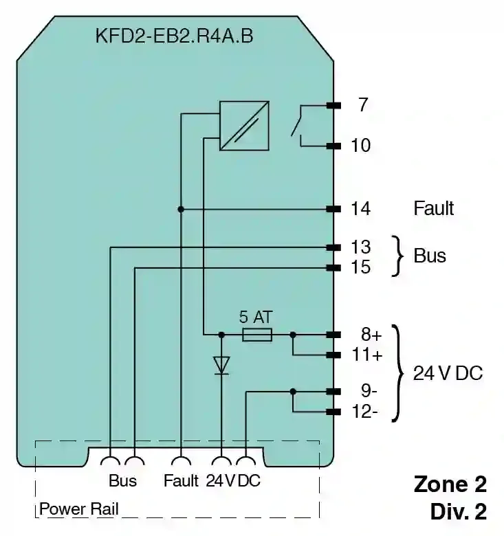 Redundant Power Feed Module. Interface for Power Rail, Used for redundant configuration, Supply current ≤ 4 A, Replaceable fuse, Relay contact output, reversible, LED status indication. Connection: terminals 11+, 12- terminals 8+, 9-. Rated voltage: 20 … 30 V DC The maximum rated operating voltage of the devices plugged onto the Power Rail must not be exceeded.. Fusing: 5 AT/250 V AC recommended maximum utilization of the fuse: 80 %. Power dissipation: ≤ 2.4 W. Connection: Power Rail. Output current: max. 4 A. Output voltage: Ui ≥ rated voltage Ur = Ui – 0.6 V. Fault signal: relay output: NO contact. Contact loading: 30 V AC/ 2 A / cos φ ≥ 0.7 ; 40 V DC/ 2 A. Energized/De-energized delay: approx. 20 ms / approx. 20 ms. Display elements: LEDs. Control elements: DIP switch. Configuration: via DIP switches. Labeling: space for labeling at the front. Electromagnetic compatibility: . Directive 2014/30/EUEN 61326-1:2013 (industrial locations): . Directive 2014/30/EU: EN 61326-1:2013 (industrial locations). Electromagnetic compatibility: NE 21:2017. Degree of protection: IEC 60529:2001. Ambient temperature: -40 … 60 °C (-40 … 140 °F) extended ambient temperature range up to 70 °C (158 °F), refer to manual for necessary mounting conditions. Degree of protection: IP20. Connection: screw terminals. Mass: approx. 100 g. Dimensions: 20 x 119 x 115 mm (0.8 x 4.7 x 4.5 inch) (W x H x D) , housing type B2. Mounting: on 35 mm DIN mounting rail acc. to EN 60715:2001. Certificate: UL 22 ATEX 2853 X. Marking II 3G Ex ec nC IIC T4 Gc: . Marking: II 3G Ex ec nC IIC T4 Gc. Directive conformity: . Directive 2014/34/EUEN IEC 60079-0:2018+AC:2020 , EN IEC 60079-7:2015+A1:2018 , EN IEC 60079-15:2019: . Directive 2014/34/EU: EN IEC 60079-0:2018+AC:2020 , EN IEC 60079-7:2015+A1:2018 , EN IEC 60079-15:2019. FM approval: FM 22 US 0031 X. Control drawing116-0160: . Control drawing: 116-0160. UL approval: E106378. CSA approval: CoC 1051840. IECEx approval: . IECEx certificateIECEx UL 16.0051XIECEx markingEx ec nC IIC T4 Gc: . IECEx certificate: IECEx UL 16.0051X. IECEx marking: Ex ec nC IIC T4 Gc. Supplementary information: Observe the certificates, declarations of conformity, instruction manuals, and manuals where applicable. For information see www.pepperl-fuchs.com.