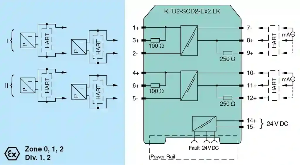 SMART Current Driver. 2-channel isolated barrier, 24 V DC supply (Power Rail), Current output up to 650 Ω load, HART-IP and valve positioner, Line fault detection (LFD), Accuracy 0.1 %, Up to SIL 2 (SC 3) acc. to IEC/EN 61508, Housing width: 20 mm, Number of channels: 2-channel, Transfer direction: to the field, HART communication, Test sockets, Safety Integrity Level (SIL): SIL 2, Systematic capability (SC): SC 3, Rated voltage: 19 … 30 V DC, Signal: 2 x 4 … 20 mA, Line fault detection. Signal type: Analog output. Safety Integrity Level (SIL): SIL 2. Systematic capability (SC): SC 3. Connection: Power Rail or terminals 14+, 15-. Rated voltage: 19 … 30 V DC. Ripple: ≤ 10 %. Rated current: ≤ 45 mA at 24 V. Power dissipation: ≤ 1 W at 20 mA and 500 Ω load. Power consumption: ≤ 1 W. Connection side: control side. Connection: terminals 7-, 8+, (9+); 10-, 11+, (12+). Input signal: 4 … 20 mA , limited to approx. 30 mA. Input voltage: open loop voltage of the control system ≤ 30 V. Voltage drop: approx. 6 V at 20 mA. Input resistance: field wiring open circuit : > 100 kΩ field wiring 100 kΩ when using terminals 1, 2 and 4, 5. Connection side: field side. Connection: terminals 1+, 2-; 4+, 5- terminals 3+, 2-; 6+, 5- (no short circuit detection). Voltage: ≥ 13 V at 20 mA. Current: 4 … 20 mA. Load: 100 … 650 Ω , for terminals 1, 2; 4, 5 0 … 550 Ω , for Terminals 2, 3; 5, 6. Ripple: 20 mV rms. Line fault detection: breakage, load > 100 kΩ, short-circuit, load < 50 Ω. Output type: open collector transistor (internal fault bus). Deviation: at 20 °C (68 °F), 4 … 20 mA< 0.1 % of full scale, incl. non-linearity and hysteresis. Influence of ambient temperature< 2 µA/K (-20 … 70 °C (-4 … 158 °F)); < 4 µA/K (-40 … -20 °C (-40 … -4 °F)): . Influence of ambient temperature: < 2 µA/K (-20 … 70 °C (-4 … 158 °F)); < 4 µA/K (-40 … -20 °C (-40 … -4 °F)). Frequency range: field side into the control side: bandwidth with 0.5 Vpp signal 0 … 3 kHz (-3 dB) control side into the field side: bandwidth with 0.5 Vpp signal 0 … 3 kHz (-3 dB). Rise time: 10 to 90 % ≤ 10 ms. Input/Output: basic insulation according to IEC/EN 61010-1, rated insulation voltage 300 Veff. Input/power supply: basic insulation according to IEC/EN 61010-1, rated insulation voltage 300 Veff. Output/power supply: reinforced insulation according to IEC/EN 61010-1, rated insulation voltage 300 Veff. Input/input: functional insulation, rated insulation voltage 50 V AC. Display elements: LEDs. Labeling: space for adhesive label at the front. Electromagnetic compatibility: . Directive 2014/30/EUEN 61326-1:2013 (industrial locations): . Directive 2014/30/EU: EN 61326-1:2013 (industrial locations). Electromagnetic compatibility: NE 21:2017 EN 61326-3-2:2018. Degree of protection: IEC 60529. Protection against electrical shock: UL 61010-1:2012. Ambient temperature: -40 … 70 °C (-40 … 158 °F). Degree of protection: IP20. Connection: screw terminals. Mass: approx. 135 g. Dimensions: 20 x 124 x 115 mm (0.8 x 4.9 x 4.5 inch) (W x H x D) , housing type B2. Mounting: on 35 mm DIN mounting rail acc. to EN 60715:2001. EU-type examination certificate: BAS 00 ATEX 7240 X. Marking II (1)G [Ex ia Ga] IIC [exsign] II (1)D [Ex ia Da] IIIC [exsign] I (M1) [Ex ia Ma] IOutputEx ia, Ex iaDVoltageUo25.2 VCurrentIo93 mAPowerPo585.3 mWInternal capacitanceCi1.05 nFInternal inductanceLi 0: . Marking: II (1)G [Ex ia Ga] IIC [exsign] II (1)D [Ex ia Da] IIIC [exsign] I (M1) [Ex ia Ma] I. Output: Ex ia, Ex iaD. Voltage: 25.2 V. Current: 93 mA. Power: 585.3 mW. Internal capacitance: 1.05 nF. Internal inductance: 0. Supply: . Maximum safe voltageUm250 V rms (Attention! The rated voltage can be lower.): Um. Maximum safe voltage: 250 V rms (Attention! The rated voltage can be lower.). Input: . Maximum safe voltageUm250 V rms (Attention! The rated voltage can be lower.): Um. Maximum safe voltage: 250 V rms (Attention! The rated voltage can be lower.). Certificate: FIDI 22 ATEX 0002 X. Marking II 3G Ex ec IIC T4 Gc: . Marking: II 3G Ex ec IIC T4 Gc. Galvanic isolation: . Input/Outputsafe electrical isolation acc. to IEC/EN 60079-11, voltage peak value 375 VOutput/power supplysafe electrical isolation acc. to IEC/EN 60079-11, voltage peak value 375 V: . Input/Output: safe electrical isolation acc. to IEC/EN 60079-11, voltage peak value 375 V. Output/power supply: safe electrical isolation acc. to IEC/EN 60079-11, voltage peak value 375 V. Directive conformity: . Directive 2014/34/EUEN IEC 60079-0:2018 , EN 60079-11:2012 , EN IEC 60079-7:2015+A1:2018: . Directive 2014/34/EU: EN IEC 60079-0:2018 , EN 60079-11:2012 , EN IEC 60079-7:2015+A1:2018. UL approval: E106378. Control drawing116-0345 (cULus): . Control drawing: 116-0345 (cULus). IECEx approval: . IECEx certificateIECEx BAS 04.0014XIECEx marking[Ex ia Ga] IIC , [Ex ia Da] IIIC , [Ex ia Ma] I Ex ec IIC T4 Gc: . IECEx certificate: IECEx BAS 04.0014X. IECEx marking: [Ex ia Ga] IIC , [Ex ia Da] IIIC , [Ex ia Ma] I Ex ec IIC T4 Gc. Supplementary information: Observe the certificates, declarations of conformity, instruction manuals, and manuals where applicable. For information see www.pepperl-fuchs.com.