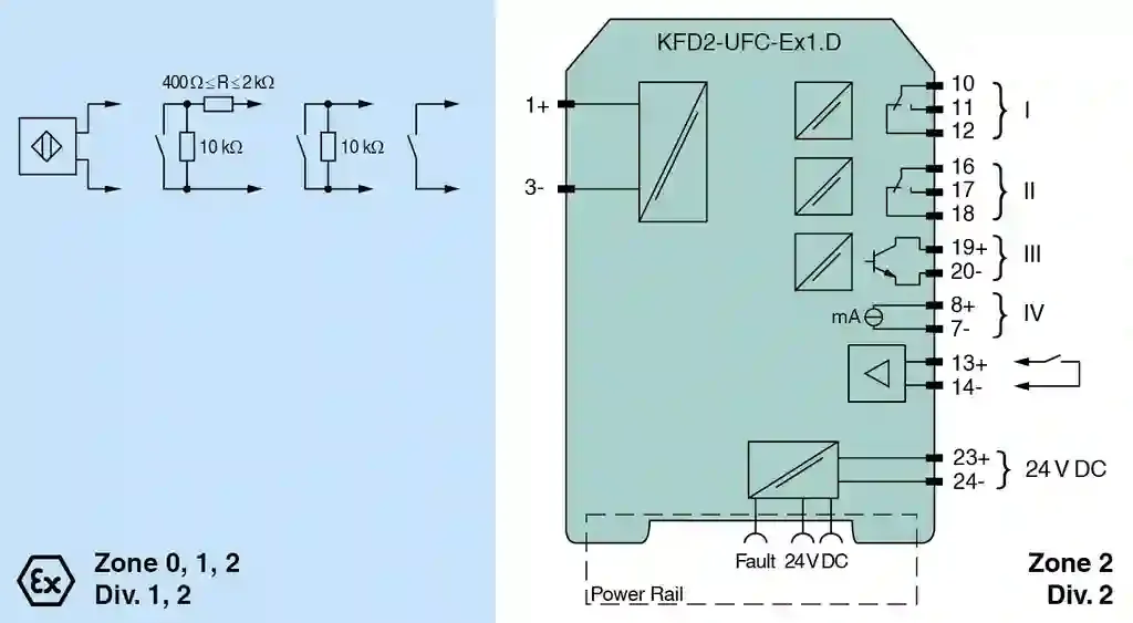 Frequency Converter with Trip Values. 1-channel isolated barrier, 24 V DC supply (Power Rail), Input for NAMUR sensors or dry contacts, Input frequency 1 mHz … 5 kHz, Current output 0/4 mA … 20 mA, Relay contact and transistor output, Start-up override, Line fault detection (LFD), Up to SIL 2 acc. to IEC/EN 61508 / IEC/EN 61511, Housing width: 40 mm, Number of channels: 1-channel, Trip relay, Start-up override, Frequency conversion, Rotation speed monitoring, Pulse divider, Safety Integrity Level (SIL): SIL 2. Signal type: Digital Input. Safety Integrity Level (SIL): SIL 2. Connection: terminals 23+, 24- or power feed module/Power Rail. Rated voltage: 20 … 30 V DC. Rated current: approx. 100 mA. Power dissipation/power consumption: ≤ 2 W / 2.2 W. Programming interface: programming socket. Connection side: field side. Connection: Input I: intrinsically safe: terminals 1+, 3- Input II: non-intrinsically safe: terminals 13+, 14-. Input I: sensor acc. to EN 60947-5-6 (NAMUR) or mechanical contact. Pulse duration> 50 µsInput frequency0.001 … 5000 HzLine fault detectionbreakage I ≤ 0.15 mA; short-circuit I > 6.5 mA: . Pulse duration: > 50 µs. Input frequency: 0.001 … 5000 Hz. Line fault detection: breakage I ≤ 0.15 mA; short-circuit I > 6.5 mA. Input II: startup override: 1 … 1000 s, adjustable in steps of 1 s. Active/PassiveI > 4 mA (for min. 100 ms) / I 4 mA (for min. 100 ms) / I 0.001 HzMeasuring time 0.001 Hz. Measuring time: < 100 ms. Influence of ambient temperature: 0.003 %/K (30 ppm). Output I, II: . Response delay≤ 200 ms: . Response delay: ≤ 200 ms. Output IV: . Resolution< 10 µAAccuracy< 20 µAInfluence of ambient temperature0.005 %/K (50 ppm): . Resolution: < 10 µA. Accuracy: 0.7; 40 V DC/2 A resistive load: Um. Maximum safe voltage: 253 V (Attention! The rated voltage can be lower.). Contact loading: 253 V AC/2 A/cos φ > 0.7; 40 V DC/2 A resistive load. Output III: terminals 19+, 20- non-intrinsically safe. Maximum safe voltage UmUm40 V (Attention! Um is no rated voltage.): Um. Maximum safe voltage Um: 40 V (Attention! Um is no rated voltage.). Output IV: terminals 8+, 7- non-intrinsically safe. Maximum safe voltageUm40 V DC (Attention! Um is no rated voltage.): Um. Maximum safe voltage: 40 V DC (Attention! Um is no rated voltage.). Interface: RS 232. Maximum safe voltageUm40 V (Attention! Um is no rated voltage.): Um. Maximum safe voltage: 40 V (Attention! Um is no rated voltage.). Certificate: TÜV 02 ATEX 1885 X. Marking II 3G Ex nA nC IIC T4 Gc: . Marking: II 3G Ex nA nC IIC T4 Gc. Output I, II: . Contact loading50 V AC/2 A/cos φ > 0.7; 40 V DC/2 A resistive load: . Contact loading: 50 V AC/2 A/cos φ > 0.7; 40 V DC/2 A resistive load. Galvanic isolation: . Input I/other circuitssafe electrical isolation acc. to IEC/EN 60079-11, voltage peak value 375 V: . Input I/other circuits: safe electrical isolation acc. to IEC/EN 60079-11, voltage peak value 375 V. Directive conformity: . Directive 2014/34/EUEN 60079-0:2012+A11:2013 , EN 60079-11:2012 , EN 60079-15:2010: . Directive 2014/34/EU: EN 60079-0:2012+A11:2013 , EN 60079-11:2012 , EN 60079-15:2010. FM approval: . Control drawing16-538FM-12: . Control drawing: 16-538FM-12. UL approval: E223772. IECEx approval: . IECEx certificateIECEx TUN 04.0007 IECEx TSA 18.0007XIECEx marking[Ex ia Ga] IIC, [Ex ia Da] IIIC, [Ex ia Ma] I Ex ec nC IIC T4 Gc: . IECEx certificate: IECEx TUN 04.0007 IECEx TSA 18.0007X. IECEx marking: [Ex ia Ga] IIC, [Ex ia Da] IIIC, [Ex ia Ma] I Ex ec nC IIC T4 Gc. Supplementary information: Observe the certificates, declarations of conformity, instruction manuals, and manuals where applicable. For information see www.pepperl-fuchs.com.