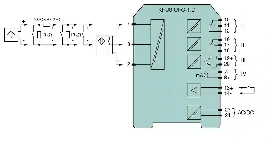 | Connection | Input I: 2-wire sensor: terminals 1+, 3- three wire sensor: terminals 1+, 2- and 3 input II: terminals 13+, 14- start-up override; |