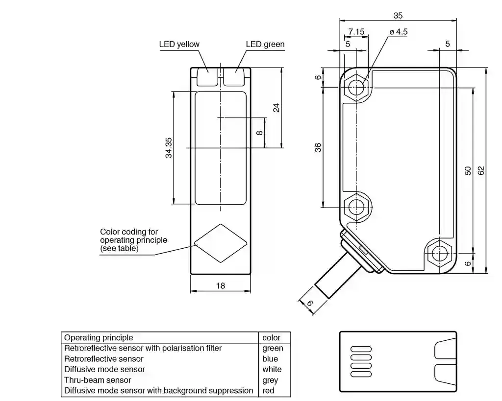 Thru-beam sensor. Thru-beam sensor, 30 m detection range, red light, light on, AC/DC version, relais output, fixed cable, Cost-optimized series for standard tasks, Large construction with small housing, Highly visible LED, Version for universal voltages, Relay output. Emitter: LA31/115. Receiver: LK31/25/31/115. Effective detection range: 0 … 30 m. Threshold detection range: 43 m. Light source: LED. Light type: modulated visible red light , 630 nm. Alignment aid: LED yellow:1. LED illuminates: Sufficient light signal received, emitter and receiver alignment is correct 2. LED flashes: Reaching switching point 3. LED off: Light beam is interrupted or the alignment is out. Diameter of the light spot: approx. 800 mm at a distance of 30 m. Opening angle: Emitter: 0.5 ° , Receiver: 1.5 °. Ambient light limit: 50000 Lux ; according to EN 60947-5-2. MTTFd: 620 a. Mission Time (TM): 20 a. Diagnostic Coverage (DC): 0 %. Operation indicator: LED green: power on. Function indicator: LED yellow:1. LED lit constantly: signal > 2 x switching point (operating reserve)2. LED flashes: signal between 1 x switching point and 2 x switching point3. LED off: signal < switching point. Operating voltage: 24 … 240 V AC 12 … 240 V DC. No-load supply current: Emitter: ≤ 20 mA Receiver: ≤ 20 mA. Power consumption: Emitter: ≤ 1 VA Receiver: ≤ 1 VA. Switching type: light-on. Signal output: Relay, 1 alternator. Switching voltage: max. 250 V AC/DC. Switching current: max. 3 A. Switching power: DC: max. 150 W AC: max. 750 VA. Switching frequency: ≤ 20 Hz. Response time: ≤ 25 ms. Product standard: EN 60947-5-2. Standard conformity: . StandardsEN 62103: . Standards: EN 62103. Protection class: II , rated voltage ≤ 250 V AC with pollution degree 1-2 according to IEC 60664-1 Output circuit basis insulation of input circuit according to EN 50178, rated insulation voltage 240 V AC. CCC approval: Certified by China Compulsory Certification (CCC). Ambient temperature: -25 … 55 °C (-13 … 131 °F). Storage temperature: -40 … 70 °C (-40 … 158 °F). Degree of protection: IP67. Connection: Emitter: 2 m fixed cable , 2-wire Receiver: 2 m fixed cable , 5-wire. Material: . HousingPolycarbonateOptical facePMMA: . Housing: Polycarbonate. Optical face: PMMA. Mass: Emitter: 116 g Receiver: 131 g. Dimensions: . Height62 mmWidth18 mmDepth35 mm: . Height: 62 mm. Width: 18 mm. Depth: 35 mm