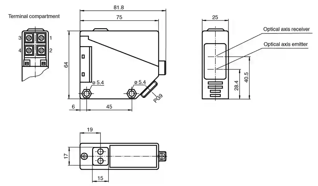 | Control elements | Sensing range adjuster, light-on/dark-on changeover switch |