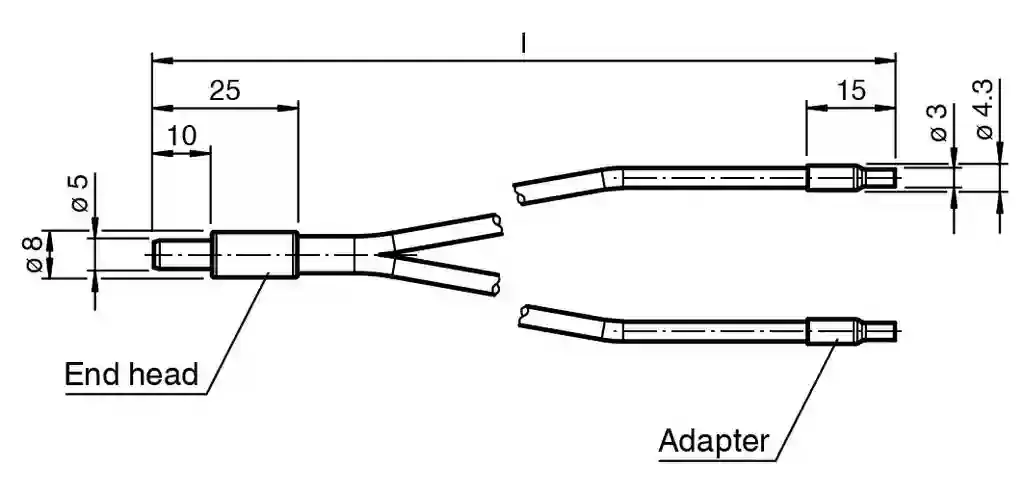 Glass fiber optic. Glass fiber optic – diffuse with PVC covering, End piece: Cylindrical, Series: Glass fiber optic – diffuse, Sheathing: PVC, Device series: KSU-LL. Fiber optic length: 150 mm. Fiber optic diameter: 5.3 mm. Adapter form: 01. End piece: Cylindrical. Bending radius: min. 15 mm. Fiber bundle diameter: 2x 1.8 mm Output area: 2x 2.5 mm2. Opening angle: approx. 68 °. Ambient temperature: -20 … 85 °C (-4 … 185 °F) [Adapter] -20 … 85 °C (-4 … 185 °F) [End head and Covering]. Storage temperature: -20 … 85 °C (-4 … 185 °F). Degree of protection: IP65. Material: . Optical faceglassSheathingPVCCoreGlass fiberEnd pieceStainless steel 1.4305 / AISI 303AdapterStainless steel 1.4305 / AISI 303: . Optical face: glass. Sheathing: PVC. Core: Glass fiber. End piece: Stainless steel 1.4305 / AISI 303. Adapter: Stainless steel 1.4305 / AISI 303. Extraction force: at probe at 20°C: 120 N. Device series: KSU-LL