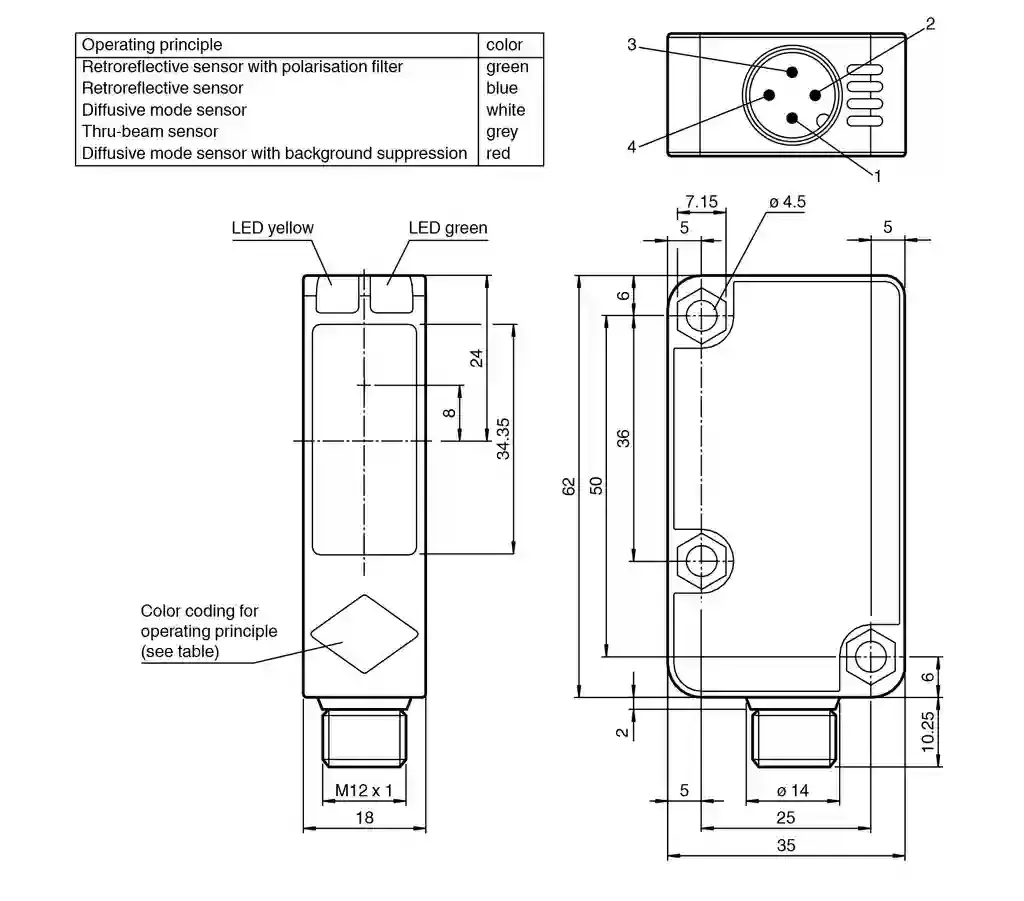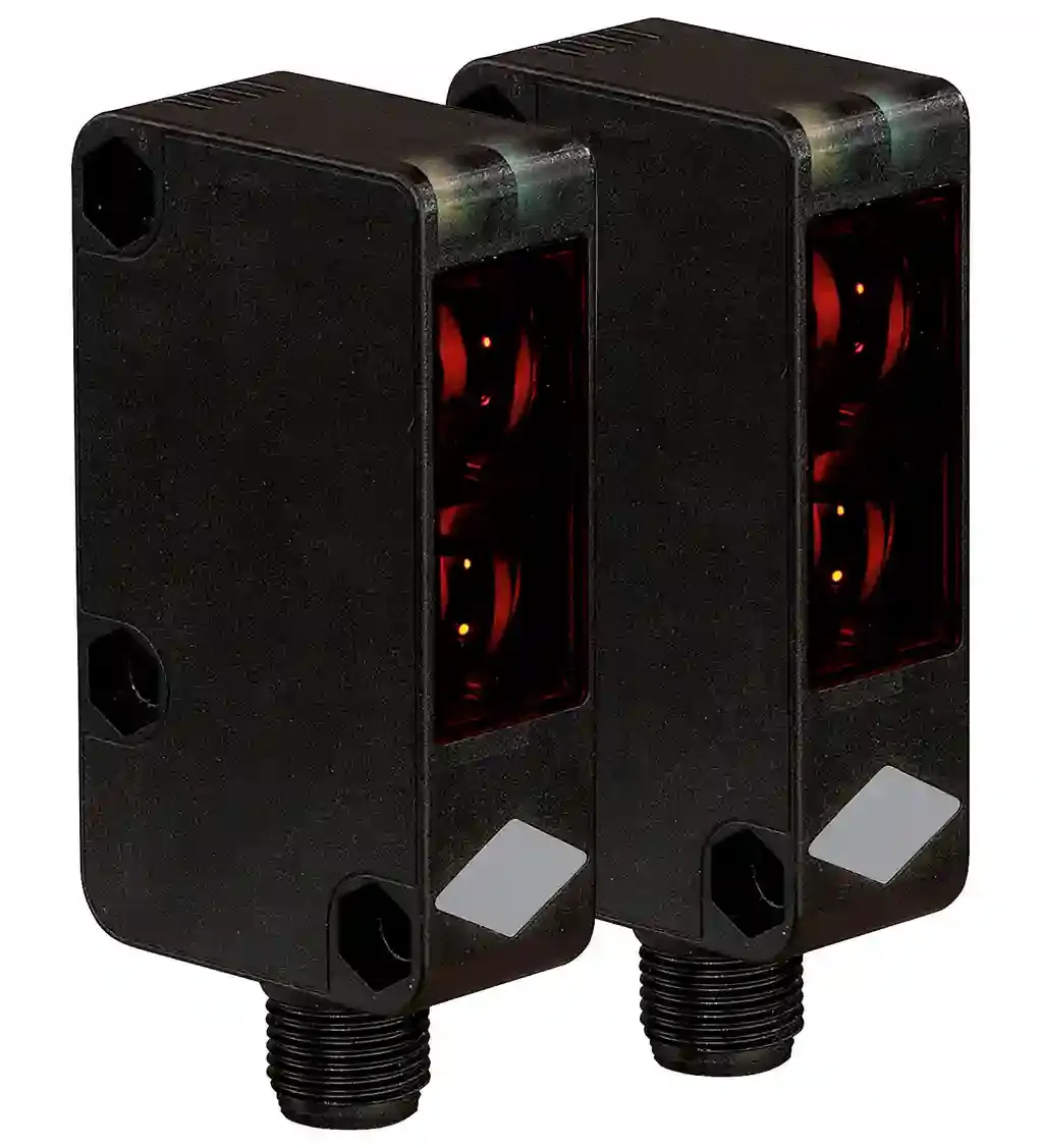 Thru-beam sensor. Thru-beam sensor, 30 m detection range, red light, dark on, DC version, 2 push-pull outputs, emitter switch-off, M12 plug, Highly visible LED, Powerful push-pull output, Compact and stable housing, Protection class II. Emitter: LD31/73c/76a. Receiver: LV31/73c/136. Effective detection range: 0 … 30 m. Threshold detection range: 43 m. Light source: LED. Light type: modulated visible red light , 630 nm. Alignment aid: LED yellow:1. LED illuminates: Sufficient light signal received, emitter and receiver alignment is correct 2. LED flashes: Reaching switching point 3. LED off: Light beam is interrupted or the alignment is out. Diameter of the light spot: approx. 800 mm at a distance of 30 m. Opening angle: Emitter: 1.5 ° , Receiver: 1.5 °. Ambient light limit: 50000 Lux ; according to EN 60947-5-2. MTTFd: 750 a. Mission Time (TM): 20 a. Diagnostic Coverage (DC): 0 %. Operation indicator: LED green: power on. Function indicator: LED yellow:1. LED lit constantly: signal > 2 x switching point (operating reserve)2. LED flashes: signal between 1 x switching point and 2 x switching point3. LED off: signal < switching point. Operating voltage: 10 … 30 V DC. Ripple: 10 %. No-load supply current: Emitter: ≤ 18 mA Receiver: ≤ 18 mA. Test input: emitter deactivation at +UB. Switching type: dark-on. Signal output: 2 push-pull (4 in 1) outputs, short-circuit protected, reverse polarity protected. Switching voltage: max. 30 V DC. Switching current: max. 100 mA. Voltage drop: ≤ 1.5 V. Switching frequency: ≤ 250 Hz. Response time: ≤ 2 ms. Product standard: EN 60947-5-2. Protection class: II , rated voltage ≤ 250 V AC with pollution degree 1-2 according to IEC 60664-1 Output circuit basis insulation of input circuit according to EN 50178, rated insulation voltage 240 V AC. UL approval: cULus Listed, Class 2 Power Source, Type 1 enclosure. CCC approval: CCC approval / marking not required for products rated ≤36 V. Ambient temperature: -30 … 55 °C (-22 … 131 °F). Storage temperature: -40 … 70 °C (-40 … 158 °F). Degree of protection: IP67. Connection: 4-pin, M12 x 1 connector. Material: . HousingPolycarbonateOptical facePMMA: . Housing: Polycarbonate. Optical face: PMMA. Mass: Emitter: 24 g Receiver: 24 g. Dimensions: . Height62 mmWidth18 mmDepth35 mm: . Height: 62 mm. Width: 18 mm. Depth: 35 mm