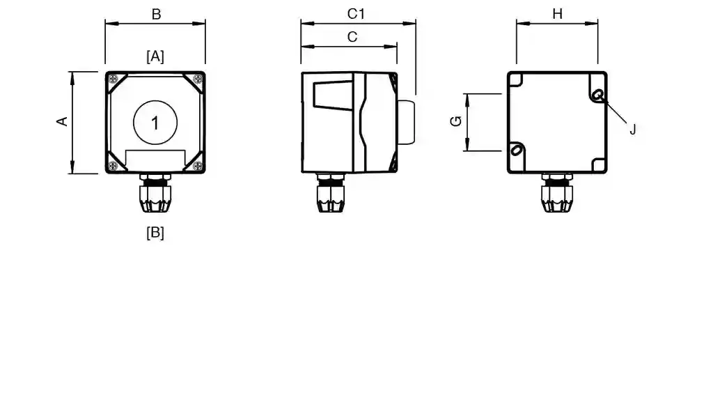 | External dimension (A)90 mmExternal dimension (B)88 mmExternal dimension (C)85 mmExternal dimension with operating element (C1)134.5 mmMounting holes distance (G)50 mmMounting holes distance (H)72.5 mmMounting holes diameter (J)5.6 mm | |
