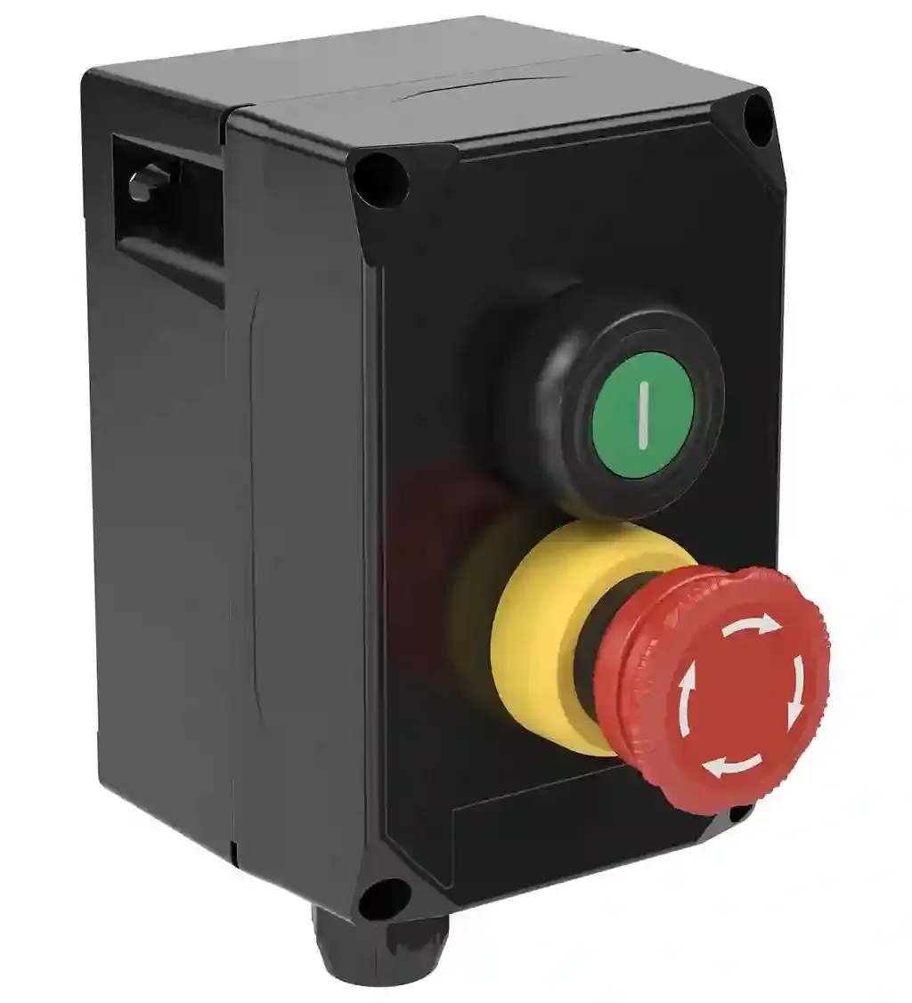 Control Unit Ex e, Polyamide, 2 Functions. Pushbutton green – 1x NO / 1x NC – labeling ‘l’, Emergency stop mushroom button 40 mm, red, twist-to-release – 1x NO / 1x NC, Polyamide (PA) enclosure, Ex db…