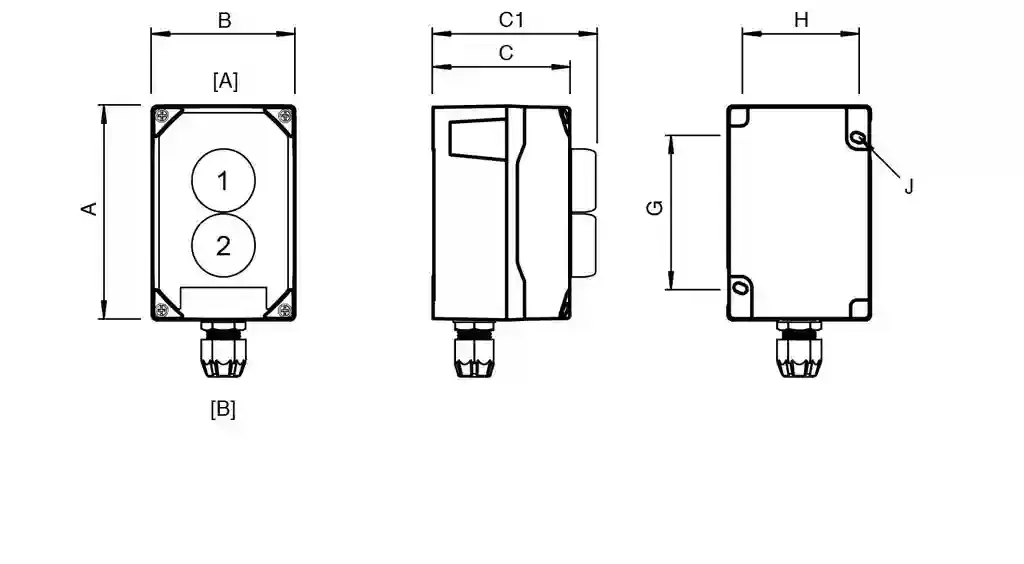 | External dimension (A)132 mmExternal dimension (B)88 mmExternal dimension (C)85 mmExternal dimension with operating element (C1)125.4 mmMounting holes distance (G)93 mmMounting holes distance (H)72.5 mmMounting holes diameter (J)5.6 mm | |