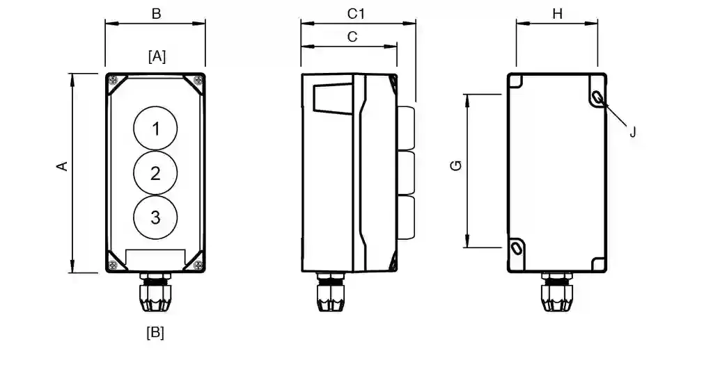 | External dimension (A)178 mmExternal dimension (B)88 mmExternal dimension (C)85 mmExternal dimension with operating element (C1)125.4 mmMounting holes distance (G)136 mmMounting holes distance (H)72.5 mmMounting holes diameter (J)5.6 mm | |
