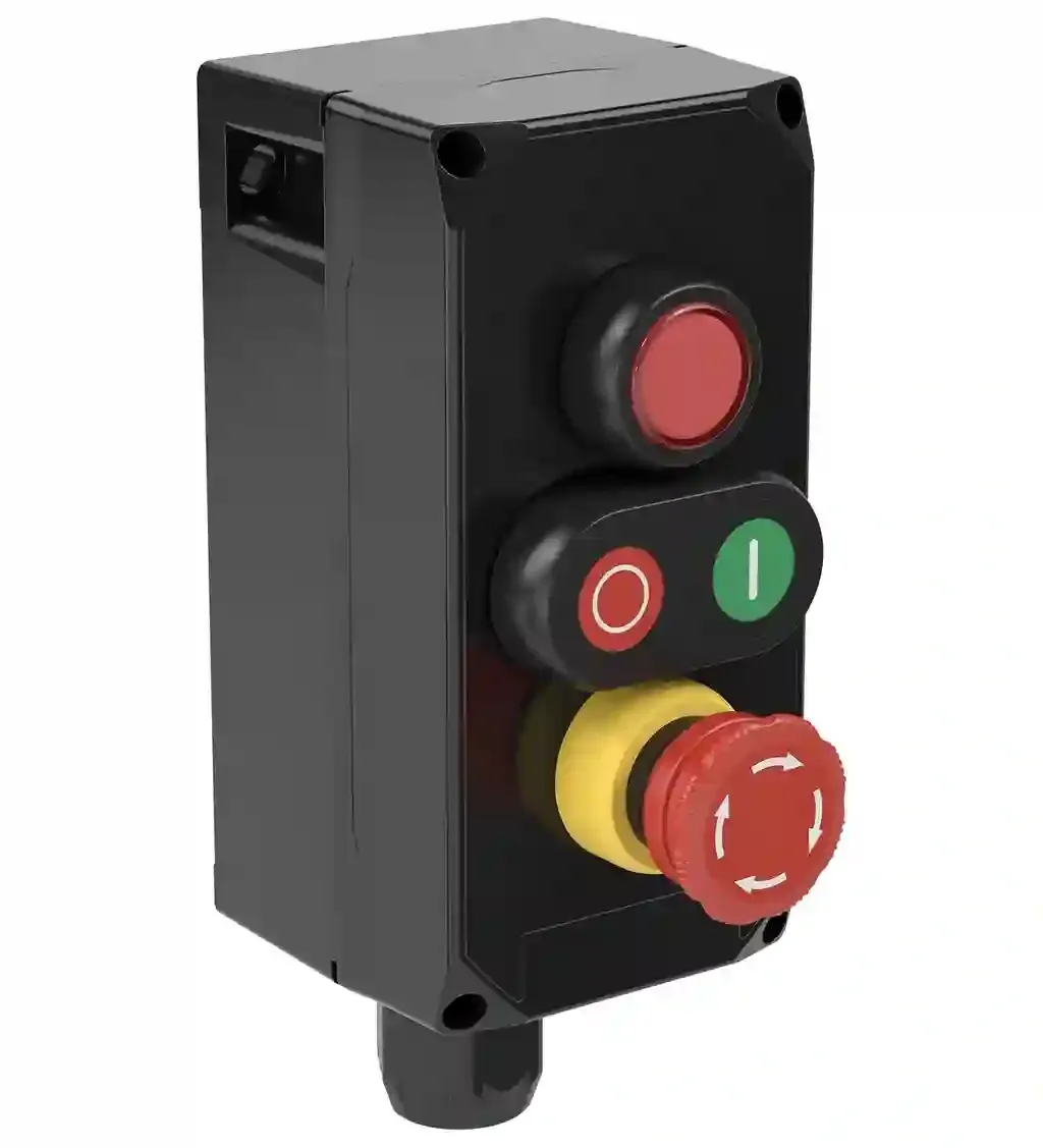 Control Unit Ex e, Polyamide, 3 Functions. LED indicator, red, Double pushbutton, red/green – 1x NO / 1x NC – labeling ‘0 – l’, Emergency stop mushroom button 40 mm, red, twist-to-release – 1x NO / 1x…