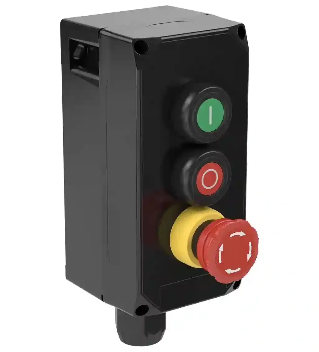 Control Unit Ex e, Polyamide, 3 Functions. Pushbutton green – 1x NO / 1x NC – labeling ‘l’, Pushbutton red – 1x NO / 1x NC – labeling ‘0’, Emergency stop mushroom button 40 mm, red, twist-to-release -…