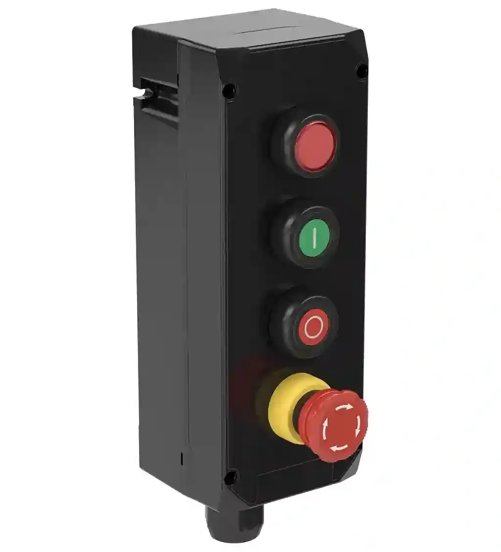 Control Unit Ex e, Polyamide, 4 Functions. LED indicator, red, Pushbutton green – 1x NO / 1x NC – labeling ‘l’, Pushbutton red – 1x NO / 1x NC – labeling ‘0’, Emergency stop mushroom button 40 mm, red…