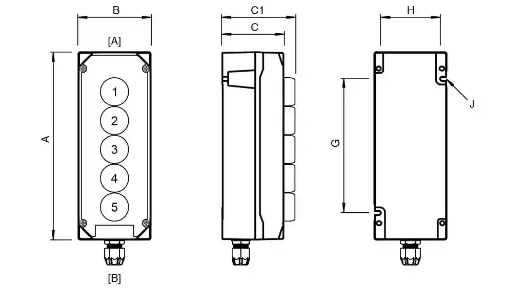 | External dimension (A)260 mmExternal dimension (B)100 mmExternal dimension (C)85 mmExternal dimension with operating element (C1)125.4 mmMounting holes distance (G)186 mmMounting holes distance (H)88 mmMounting holes diameter (J)5.6 mm | |