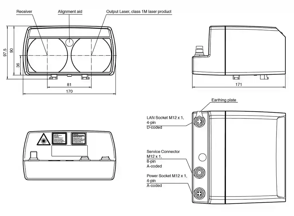 Optical data coupler. Optical data coupler for fast Ethernet, 300 m detection range, red light, 100 Mbit/s data rate, M12 plug, Independent of Ethernet protocol, TCP/IP, PROFINET, PROFIsafe, EtherCAT, FSoE, EtherNet/IP™, Ethernet POWERLINK etc., Plug connection for fast mounting, No parameterization, Line indicator for signal strength. Effective detection range: 0 … 300 m. Threshold detection range: 350 m. Light source: laser diode. Light type: modulated visible red light. Laser nominal ratings: . NoteVISIBLE LASER RADIATION , DO NOT VIEW DIRECTLY WITH OPTICAL INSTRUMENTSLaser class1MWave length660 nmBeam divergence15 mradPulse length8 nsRepetition rate62.5 MHzMaximum optical power output60 mW: . Note: VISIBLE LASER RADIATION , DO NOT VIEW DIRECTLY WITH OPTICAL INSTRUMENTS. Laser class: 1M. Wave length: 660 nm. Beam divergence: 15 mrad. Pulse length: 8 ns. Repetition rate: 62.5 MHz. Maximum optical power output: 60 mW. Diameter of the light spot: 1.5 m at a distance of 100 m. Opening angle: 1 °. Ambient light limit: > 10000 Lux. MTTFd: 58.6 a. Mission Time (TM): 10 a. Diagnostic Coverage (DC): 0 %. Data flow indicator: LED green: OPTO-Link LED yellow: LAN-Link LED red: ERROR. Function indicator: Signal strength (8 LED: Red, yellow, green). Operating voltage: 18 … 30 V DC. No-load supply current: 200 mA. Interface type: Ethernet; 100 BASE-TX. Physical: M12, D-coded. Protocol: PROFINET EtherNet/IP EtherCAT® Ethernet POWERLINK PROFIsafe. Transfer rate: 100 MBit/s (Fast Ethernet). Stability alarm output: 1 PNP, inactive when falling short of the operating reserve , short-circuit protected, max. 200 mA. Laser safety: EN 60825-1:2007. UL approval: cULus Listed. FDA approval: IEC 60825-1:2007 Complies with 21 CFR 1040.10 and 1040.11 except for deviations pursuant to Laser Notice No. 50, dated June 24, 2007. Ambient temperature: -10 … 50 °C (14 … 122 °F). Storage temperature: -20 … 70 °C (-4 … 158 °F). Degree of protection: IP65. Material: . HousingABS / PCOptical faceplastic: . Housing: ABS / PC. Optical face: plastic. Mass: 700 g. Dimensions: . Height90 mmWidth170 mmLength171 mm: . Height: 90 mm. Width: 170 mm. Length: 171 mm