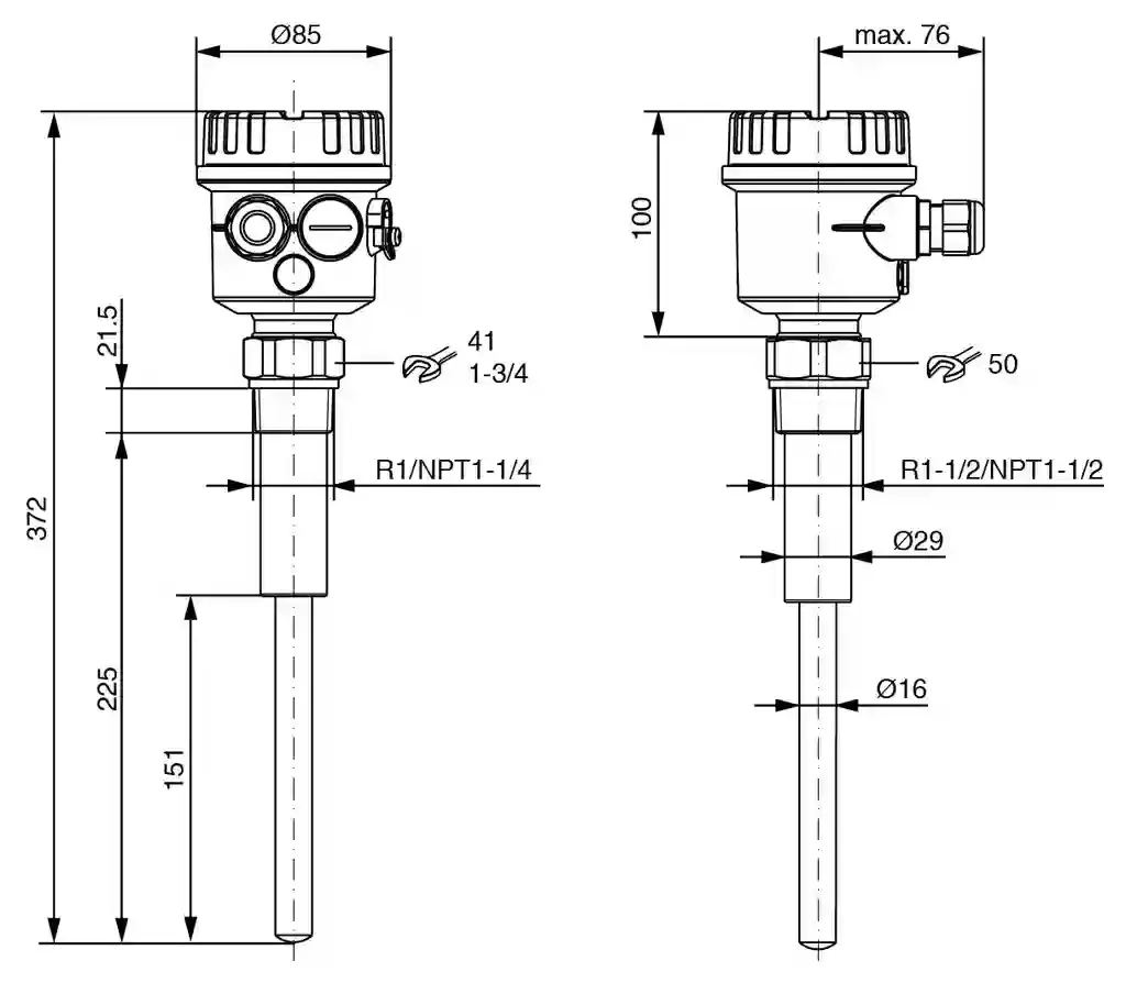 Process connectionthread R1, R1-1/2 acc. to DIN 2999thread 1-1/4 - 11-1/2 NPT, 1-1/2 - 11-1/2 NPT acc. to ANSI B 1.20.1