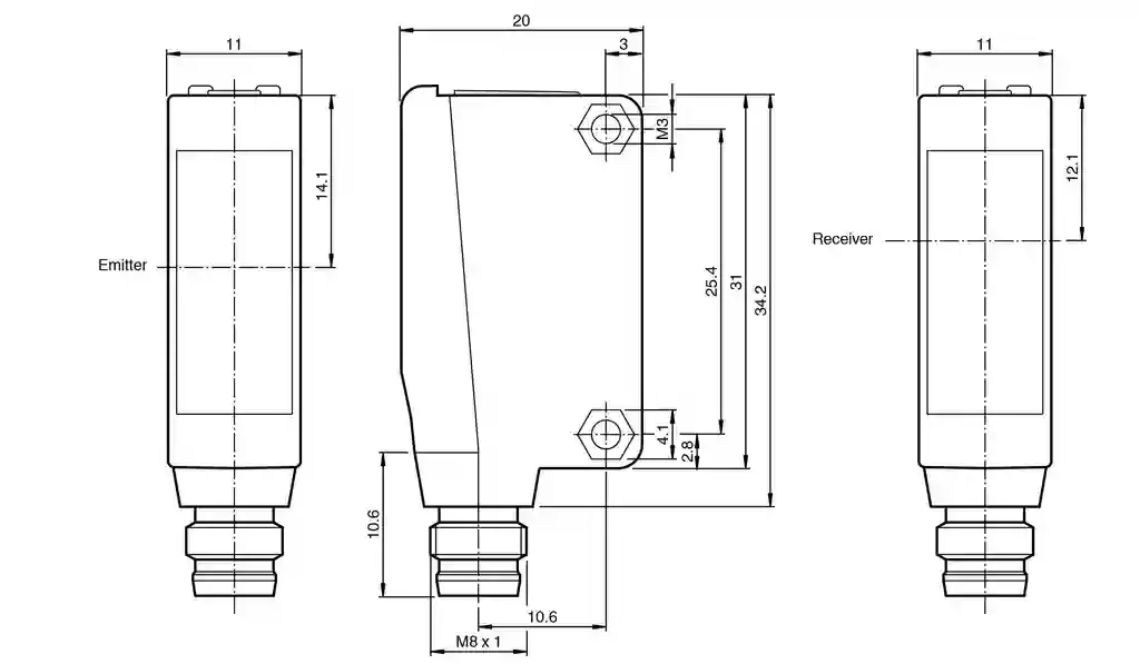 Thru-beam sensor (pair). Thru-beam sensor, 20 m detection range, red light, light/dark on, DC version, PNP output, sensitivity adjuster, emitter switch-off, M8 plug, Miniature design, Easy to use, Very bright, highly visible light spot, Full metal thread mounting, Highly visible LEDs for Power ON and switching state. Emitter: M100-RT/35/76a/95. Receiver: MV100-RT/35/95/103. Effective detection range: 0 … 20 m. Threshold detection range: 30 m. Light source: LED. Light type: modulated visible red light. Diameter of the light spot: approx. 2 m at a distance of 30 m. Opening angle: approx. 2 °. Optical face: frontal. Ambient light limit: EN 60947-5-2. MTTFd: 860 a. Mission Time (TM): 20 a. Diagnostic Coverage (DC): 0 %. Operation indicator: LED green: power on. Function indicator: Receiver: LED yellow, lights up when light beam is free, flashes when falling short of the operating reserve ; OFF when light beam is interrupted. Control elements: sensitivity adjustment. Control elements: Light-on/dark-on changeover switch. Operating voltage: 10 … 30 V DC. Ripple: max. 10 %. No-load supply current: Emitter: ≤ 15 mA Receiver: ≤ 8 mA. Test input: emitter deactivation at +UB. Switching type: The switching type of the sensor is adjustable. The default setting is: light-on. Signal output: 1 PNP output, short-circuit protected, reverse polarity protected, open collector. Switching voltage: max. 30 V DC. Switching current: max. 100 mA , resistive load. Voltage drop: ≤ 1.5 V DC. Switching frequency: 250 Hz. Response time: 2 ms. Product standard: EN 60947-5-2. UL approval: cULus Listed, Class 2 Power Source or listed Power Supply with a limited voltage output with (maybe integrated) fuse (max. 3.3 A according UL248), Type 1 enclosure. CCC approval: CCC approval / marking not required for products rated ≤36 V. Ambient temperature: -30 … 60 °C (-22 … 140 °F). Storage temperature: -40 … 70 °C (-40 … 158 °F). Degree of protection: IP67. Connection: M8 x 1 connector, 4-pin. Material: . HousingPC (Polycarbonate)Optical facePMMA: . Housing: PC (Polycarbonate). Optical face: PMMA. Mass: approx. 20 g (emitter and receiver). Tightening torque, fastening screws: 0.6 Nm. Dimensions: . Height31 mmWidth11 mmDepth20 mm: . Height: 31 mm. Width: 11 mm. Depth: 20 mm