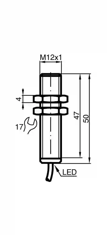 Magnetic field sensor. Switching function: Normally open (NO), Output type: NPN, Installation: flush in non-magnetic metal, Output polarity: DC, Output type: 3-wire, Thread mold: M12, Construction type: Cylindrical, thread, Series: Cylindrical type, Threading: with, Type of voltage: DC, Connection type: cable, Housing material: brass, nickel-plated, Degree of protection: IP67. Switching function: Normally open (NO). Output type: NPN. Rated operating distance: 80 mm. Installation: flush in non-magnetic metal. Output polarity: DC. Assured operating distance: 20 … 64.8 mm. Output type: 3-wire. Operating voltage: 10 … 30 V. Switching frequency: 0 … 5000 Hz. Reverse polarity protection: reverse polarity protected. Short-circuit protection: pulsing. Voltage drop: ≤ 2.5 V. Operating current: 0 … 200 mA. No-load supply current: ≤ 20 mA. Switching state indicator: LED, yellow. Standard conformity: . StandardsEN IEC 60947-5-2: . Standards: EN IEC 60947-5-2. CCC approval: CCC approval / marking not required for products rated ≤36 V. Ambient temperature: -25 … 70 °C (-13 … 158 °F). Connection type: cable. Housing material: brass, nickel-plated. Sensing face: PBT. Degree of protection: IP67. Cable: . Wire end ferrulesyesCable diameter3 mm – 0.2 mmBending radius> 12 x cable diameterMaterialPURColorblackNumber of cores3Core cross section0.14 mm2LengthL2 m: . Wire end ferrules: yes. Cable diameter: 3 mm – 0.2 mm. Bending radius: > 12 x cable diameter. Material: PUR. Color: black. Number of cores: 3. Core cross section: 0.14 mm2. Length: 2 m. Dimensions: . Length50 mmDiameter12 mm: . Length: 50 mm. Diameter: 12 mm