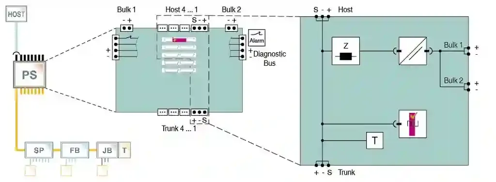 Power Hub Motherboard. Power hub motherboard with common host interface, 4 segments, individual modules per segment, Supports all PLC and PCS hosts, High-power trunk: Live work on devices in any hazardous area, Best quality, smallest size and lowest heat dissipation, For FOUNDATION Fieldbus H1, IECEx approval, International, Europe, USA, Canada, Device coupler location: non-explosion hazardous areaZone 2 – high-power trunkZone 1 – high-power trunkDivision 2 – high-power trunkDivision 1 – high-power trunk