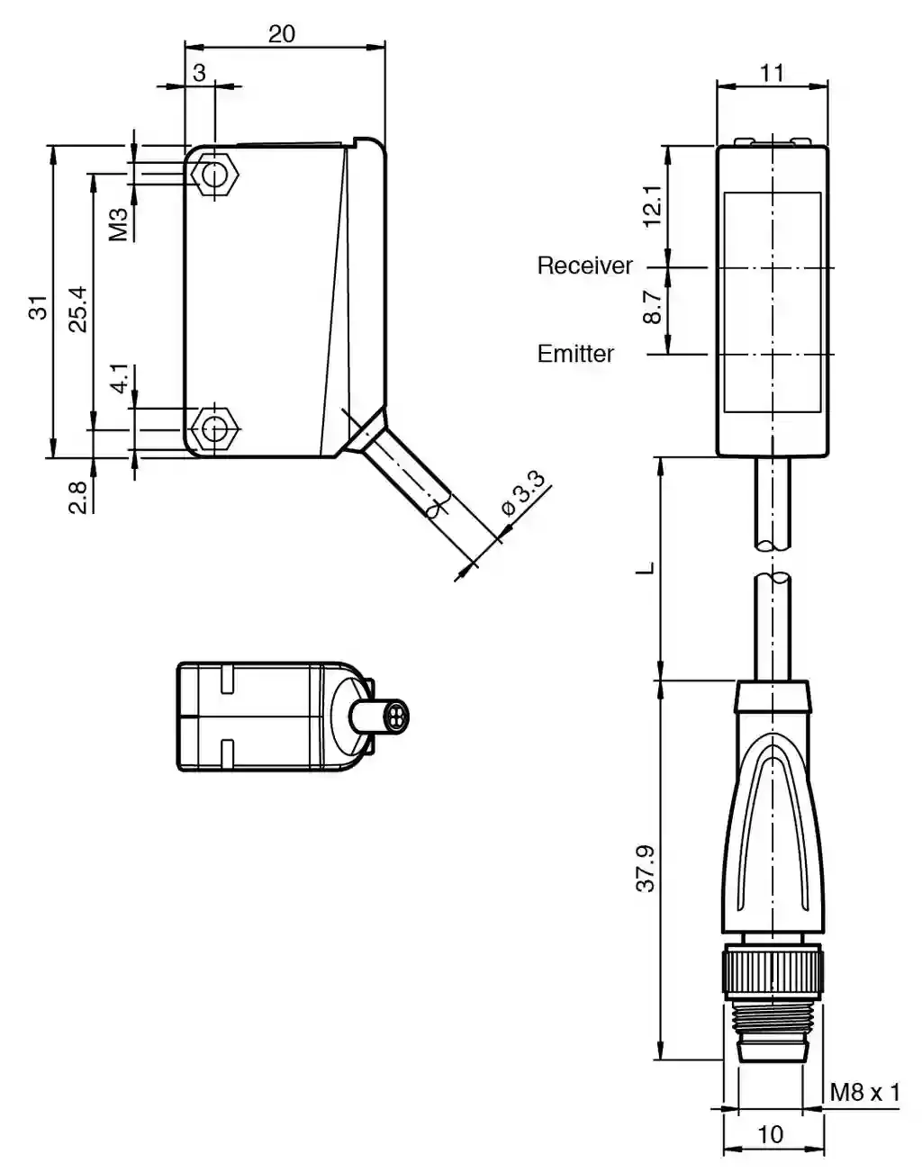 Retroreflective sensor. Retroreflective sensor with polarization filter, plastic housing, 5 m detection range, red light, sensitivity adjuster, light/dark on, DC version, PNP output, fixed cable with M8 plug, Miniature design, Easy to use, Clearly visible LEDs for Power ON, switching state and weak signal indication, Full metal thread mounting, Very bright, highly visible light spot. Effective detection range: 0 … 5 m. Reflector distance: 0.02 … 5 m. Threshold detection range: 7 m. Reference target: H50 reflector. Light source: LED. Light type: modulated visible red light. Polarization filter: yes. Diameter of the light spot: approx. 500 mm at a distance of 7 m. Opening angle: approx. 4 °. Optical face: frontal. Ambient light limit: EN 60947-5-2:2007+A1:2012. MTTFd: 860 a. Mission Time (TM): 20 a. Diagnostic Coverage (DC): 0 %. Operation indicator: LED green: power on. Function indicator: LED yellow: lights up when receiving the light beam ; flashes when falling short of the operating reserve; OFF when light beam is interrupted. Control elements: sensitivity adjustment. Control elements: Light-on/dark-on changeover switch. Operating voltage: 10 … 30 V DC. Ripple: max. 10 %. No-load supply current: < 20 mA. Switching type: The switching type of the sensor is adjustable. The default setting is: light-on. Signal output: 1 PNP output, short-circuit protected, reverse polarity protected, open collector. Switching voltage: max. 30 V DC. Switching current: max. 100 mA , resistive load. Voltage drop: ≤ 1.5 V DC. Switching frequency: 1000 Hz. Response time: 0.5 ms. Product standard: EN 60947-5-2. UL approval: cULus Listed, Class 2 Power Source or listed Power Supply with a limited voltage output with (maybe integrated) fuse (max. 3.3 A according UL248), Type 1 enclosure. CCC approval: CCC approval / marking not required for products rated ≤36 V. Ambient temperature: -30 … 60 °C (-22 … 140 °F). Storage temperature: -40 … 70 °C (-40 … 158 °F). Degree of protection: IP67. Connection: 300 mm fixed cable with M8 connector, 4-pin. Material: . HousingPC (Polycarbonate)Optical facePMMA: . Housing: PC (Polycarbonate). Optical face: PMMA. Mass: approx. 20 g. Tightening torque, fastening screws: 0.6 Nm. Dimensions: . Height31 mmWidth11 mmDepth20 mm: . Height: 31 mm. Width: 11 mm. Depth: 20 mm. Cable length: 0.3 m
