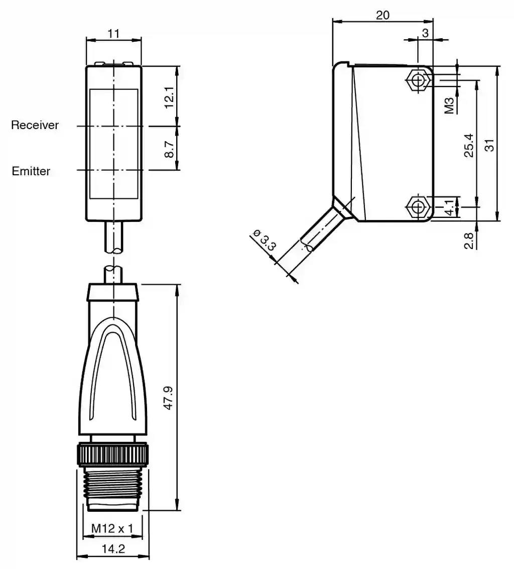 Retroreflective sensor. Retroreflective sensor with polarization filter, plastic housing, 5 m detection range, red light, sensitivity adjuster, light/dark on, DC version, PNP output, fixed cable with M12 plug, Miniature design, Easy to use, Full metal thread mounting, Clearly visible LEDs for Power ON, switching state and weak signal indication, Not sensitive to ambient light. Effective detection range: 0 … 5 m. Reflector distance: 0.02 … 5 m. Threshold detection range: 7 m. Reference target: H50 reflector. Light source: LED. Light type: modulated visible red light. Polarization filter: yes. Diameter of the light spot: approx. 500 mm at a distance of 7 m. Opening angle: approx. 4 °. Optical face: frontal. Ambient light limit: EN 60947-5-2:2007+A1:2012. MTTFd: 860 a. Mission Time (TM): 20 a. Diagnostic Coverage (DC): 0 %. Operation indicator: LED green: power on. Function indicator: LED yellow: lights up when receiving the light beam ; flashes when falling short of the operating reserve; OFF when light beam is interrupted. Control elements: sensitivity adjustment. Control elements: Light-on/dark-on changeover switch. Operating voltage: 10 … 30 V DC. Ripple: max. 10 %. No-load supply current: < 20 mA. Switching type: The switching type of the sensor is adjustable. The default setting is: light-on. Signal output: 1 PNP output, short-circuit protected, reverse polarity protected, open collector. Switching voltage: max. 30 V DC. Switching current: max. 100 mA , resistive load. Voltage drop: ≤ 1.5 V DC. Switching frequency: 1000 Hz. Response time: 0.5 ms. Product standard: EN 60947-5-2. UL approval: cULus Listed, Class 2 Power Source or listed Power Supply with a limited voltage output with (maybe integrated) fuse (max. 3.3 A according UL248), Type 1 enclosure. CCC approval: CCC approval / marking not required for products rated ≤36 V. Ambient temperature: -30 … 60 °C (-22 … 140 °F). Storage temperature: -40 … 70 °C (-40 … 158 °F). Degree of protection: IP67. Connection: 300 mm fixed cable with 4-pin, M12 x 1 connector. Material: . HousingPC (Polycarbonate)Optical facePMMA: . Housing: PC (Polycarbonate). Optical face: PMMA. Mass: approx. 20 g. Tightening torque, fastening screws: 0.6 Nm. Dimensions: . Height31 mmWidth11 mmDepth20 mm: . Height: 31 mm. Width: 11 mm. Depth: 20 mm. Cable length: 0.3 m