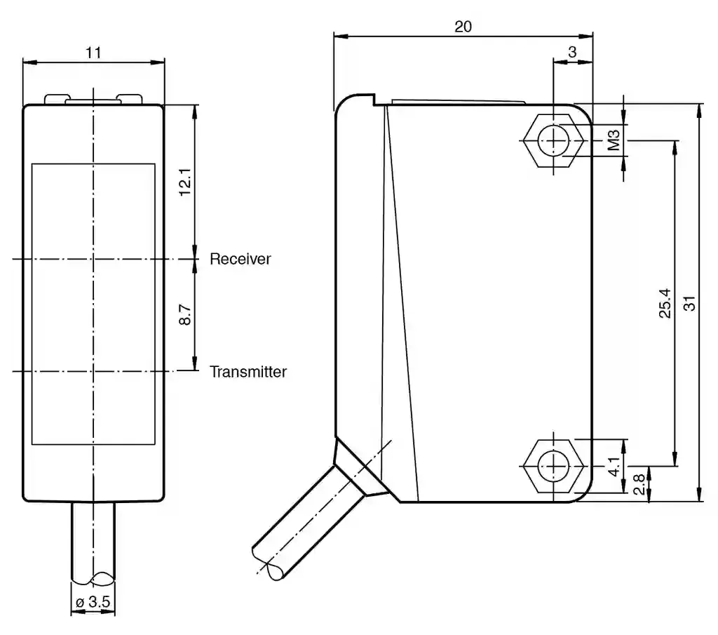 Diffuse mode sensor. Diffuse mode sensor with rectangular light spot for clear object detection, 200 mm detection range, red light, light/dark on, sensitivity adjuster, DC version, NPN output, fixed cable, Miniature design, Detects transparent materials, Full metal thread mounting, Not sensitive to ambient light, The extra-large light spot makes the device insensitive to vibrations and skewing of the object. Detection range: 0 … 200 mm. Adjustment range: 15 … 200 mm. Reference target: standard white , 200 mm x 200 mm. Light source: LED. Light type: modulated visible red light. Polarization filter: no. Diameter of the light spot: approx. 170 mm at a distance of 200 mm. Optical face: frontal. Ambient light limit: EN 60947-5-2:2007+A1:2012. MTTFd: 860 a. Mission Time (TM): 20 a. Diagnostic Coverage (DC): 0 %. Operation indicator: LED green: power on. Function indicator: LED yellow, lights up with receiver lit. Control elements: sensitivity adjustment. Control elements: Light-on/dark-on changeover switch. Operating voltage: 10 … 30 V DC. Ripple: max. 10 %. No-load supply current: < 20 mA. Switching type: The switching type of the sensor is adjustable. The default setting is: light-on. Signal output: 1 NPN output, short-circuit protected, reverse polarity protected, open collector. Switching voltage: max. 30 V DC. Switching current: max. 100 mA , resistive load. Voltage drop: ≤ 1.5 V DC. Switching frequency: 1000 Hz. Response time: 0.5 ms. Product standard: EN 60947-5-2. UL approval: cULus Listed, Class 2 Power Source or listed Power Supply with a limited voltage output with (maybe integrated) fuse (max. 3.3 A according UL248), Type 1 enclosure. CCC approval: CCC approval / marking not required for products rated ≤36 V. Ambient temperature: -30 … 60 °C (-22 … 140 °F). Storage temperature: -40 … 70 °C (-40 … 158 °F). Degree of protection: IP67. Connection: 2 m fixed cable. Material: . HousingPC (Polycarbonate)Optical facePMMA: . Housing: PC (Polycarbonate). Optical face: PMMA. Mass: approx. 50 g. Tightening torque, fastening screws: 0.6 Nm. Dimensions: . Height31 mmWidth11 mmDepth20 mm: . Height: 31 mm. Width: 11 mm. Depth: 20 mm. Cable length: 2 m