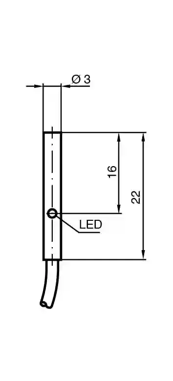 Inductive sensor. Switching function: Normally open (NO), Output type: PNP, Installation: flush, Output polarity: DC, Output type: 3-wire, Construction type: Cylindrical, flat, Series: Cylindrical type, Type of voltage: DC, Connection type: cable, Housing material: Stainless steel 1.4305 / AISI 303, Degree of protection: IP67, Material: PUR. Switching function: Normally open (NO). Output type: PNP. Rated operating distance: 1 mm. Installation: flush. Output polarity: DC. Assured operating distance: 0 … 0.81 mm. Reduction factor rAl: 0.4. Reduction factor rCu: 0.29. Reduction factor r304: 0.76. Reduction factor rBrass: 0.46. Output type: 3-wire. Operating voltage: 10 … 30 V. Switching frequency: 0 … 700 Hz. Hysteresis: typ. 5%. Reverse polarity protection: reverse polarity protected. Short-circuit protection: pulsing. Voltage drop: ≤ 3 V. Operating current: 0 … 100 mA. Off-state current: 0 … 0.1 mA typ. at 25 °C. No-load supply current: ≤ 10 mA. Switching state indicator: LED, yellow. MTTFd: 1340 a. Mission Time (TM): 20 a. Diagnostic Coverage (DC): 0 %. Standard conformity: . StandardsEN IEC 60947-5-2: . Standards: EN IEC 60947-5-2. UL approval: cULus Listed Load Type: General Purpose Circuitry: Class 2 Power Source Enclosure Type Rating: Type 1 Supply/Switching Voltage: 30 V DC Output Switching Current: 100 mA. CCC approval: CCC approval / marking not required for products rated ≤36 V. Ambient temperature: -25 … 70 °C (-13 … 158 °F). Connection type: cable. Housing material: Stainless steel 1.4305 / AISI 303. Sensing face: PC. Degree of protection: IP67. Cable: . Cable diameter2.6 mm ± 0.1 mmBending radius> 10 x cable diameterMaterialPURColorgreyNumber of cores3Core cross section0.055 mm2LengthL2 m: . Cable diameter: 2.6 mm ± 0.1 mm. Bending radius: > 10 x cable diameter. Material: PUR. Color: grey. Number of cores: 3. Core cross section: 0.055 mm2. Length: 2 m. Dimensions: . Length22 mmDiameter3 mm: . Length: 22 mm. Diameter: 3 mm