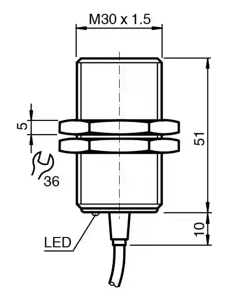 Inductive sensor. Extended temperature range, Switching function: Normally open (NO), Output type: NPN, Installation: flush, Output polarity: DC, Output type: 3-wire, Thread mold: M30, Construction type: Cylindrical, thread, Series: Cylindrical type, Type of voltage: DC, Connection type: cable, Housing material: brass, nickel-plated, Degree of protection: IP68 / IP69K, Material: PUR. Switching function: Normally open (NO). Output type: NPN. Rated operating distance: 15 mm. Installation: flush. Output polarity: DC. Assured operating distance: 0 … 12.15 mm. Reduction factor rAl: 0.45. Reduction factor rCu: 0.4. Reduction factor r304: 0.7. Reduction factor rBrass: 0.5. Output type: 3-wire. Operating voltage: 5 … 60 V. Switching frequency: 0 … 600 Hz. Hysteresis: typ. 5 %. Reverse polarity protection: reverse polarity protected. Short-circuit protection: pulsing. Inductive overvoltage protection: yes. Surge suppression: yes. Voltage drop: ≤ 2 V. Rated insulation voltage: 60 V. Operating current: 0 … 200 mA. Off-state current: 0 … 0.5 mA typ. 6 µA at 25 °C. No-load supply current: ≤ 7 mA. Time delay before availability: ≤ 220 ms. Switching state indicator: LED, yellow. MTTFd: 830.5 a. Mission Time (TM): 20 a. Diagnostic Coverage (DC): 0 %. Standard conformity: . StandardsEN IEC 60947-5-2: . Standards: EN IEC 60947-5-2. UL approval: cULus Listed Load Type: General Purpose Circuitry: Class 2 Power Source Enclosure Type Rating: Type 1 Supply/Switching Voltage: 60 V DC Output Switching Current: 200 mA. CSA approval: cCSAus Listed, General Purpose, Class 2 Power Source. CCC approval: Certified by China Compulsory Certification (CCC). E1 Type approval: 10R-04. Ambient temperature: -40 … 85 °C (-40 … 185 °F). Storage temperature: -40 … 85 °C (-40 … 185 °F). Connection type: cable. Housing material: brass, nickel-plated. Sensing face: PBT. Degree of protection: IP68 / IP69K. Cable: . Wire end ferrulesyesCable diameter6 mm ± 0.2 mmBending radius> 6 x cable diameterMaterialPURColorblackNumber of cores3Core cross section0.75 mm2LengthL2 m: . Wire end ferrules: yes. Cable diameter: 6 mm ± 0.2 mm. Bending radius: > 6 x cable diameter. Material: PUR. Color: black. Number of cores: 3. Core cross section: 0.75 mm2. Length: 2 m. Mass: 190 g. Dimensions: . Length61 mmDiameter30 mm: . Length: 61 mm. Diameter: 30 mm