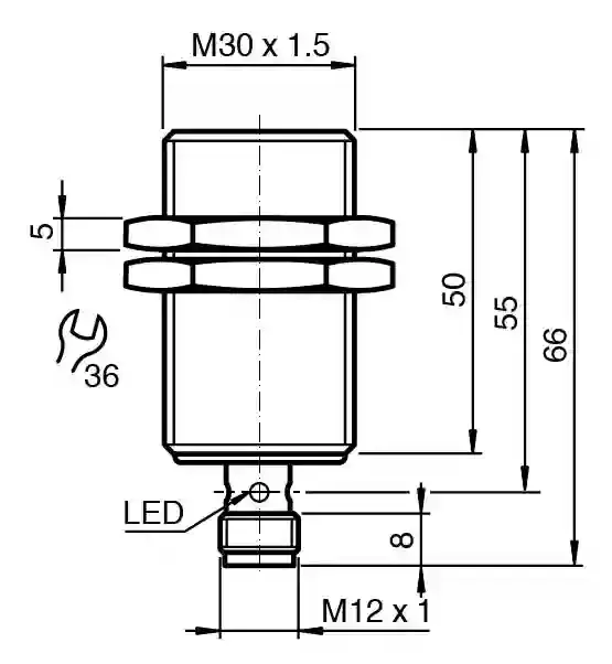 Inductive sensor. Extended temperature range, Output type: Digital current output, Installation: flush, Output polarity: DC, Output type: 3-wire, Thread mold: M30, Construction type: Cylindrical, thread, Series: Cylindrical type, Operating voltage: 9 … 30 V DC, Type of voltage: DC, Ambient temperature: -40 … 85 °C (-40 … 185 °F) , Connection type: Connector plug, Housing material: brass, nickel-plated, Degree of protection: IP68 / IP69K, Threading: M12 x 1. Output type: Digital current output. Rated operating distance: 15 mm. Installation: flush. Output polarity: DC. Assured operating distance: 0 … 12.15 mm. Actuating element: mild steel, e. g. 1.0037, SR235JR (formerly St37-2) 45 mm x 45 mm x 1 mm. Reduction factor rAl: 0.5. Reduction factor rCu: 0.4. Reduction factor r304: 0.7. Reduction factor rBrass: 0.5. Output type: 3-wire. Operating voltage: 9 … 30 V DC. Switching frequency: 0 … 700 Hz. Hysteresis: 2 … 15 %. Reverse polarity protection: reverse polarity protected. Short-circuit protection: yes. Temperature drift: ≤ 10 %. Time delay before availability: ≤ 5 ms. Load resistor: 100 … 250 Ohm. Switching state indicator: LED, yellow. MTTFd: 1556 a. Mission Time (TM): 20 a. Diagnostic Coverage (DC): 0 %. Output value: object detected: 10 mA ± 1 mA object not detected: 5 mA ± 1 mA. Standard conformity: . StandardsEN IEC 60947-5-2: . Standards: EN IEC 60947-5-2. UL approval: cULus Listed Load Type: General Purpose Circuitry: Class 2 Power Source Supply/Switching Voltage: 30 V DC Output Switching Current: 10 mA. E1 Type approval: 10R-04. Ambient temperature: -40 … 85 °C (-40 … 185 °F). Storage temperature: -40 … 85 °C (-40 … 185 °F). Connection type: Connector plug. Housing material: brass, nickel-plated. Sensing face: PBT. Degree of protection: IP68 / IP69K. Connector: . ThreadingM12 x 1Number of pins3: . Threading: M12 x 1. Number of pins: 3. Mass: 140 g. Dimensions: . Length65 mmDiameter30 mm: . Length: 65 mm. Diameter: 30 mm. Scope of delivery: 2 self locking nuts in scope of delivery
